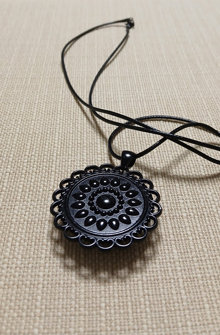 Baza to stop cynku i aluminium w czarnym kolorze. Wisior jest lekki, nie odbarwia, nie zmienia też swojego koloru z biegiem lat.