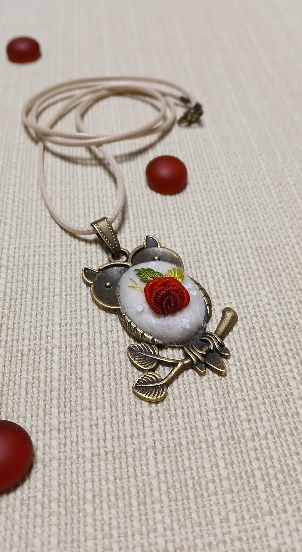 Perfekcyjnie dopracowany haft na filcu wykonałam polską bawełnianą muliną za pomocą igły. Jest on zabezpieczony impregnatem do tkanin ale po dłuższym użytkowaniu można go odświeżyć przy pomocy delikatnego mydła i letniej wody.
