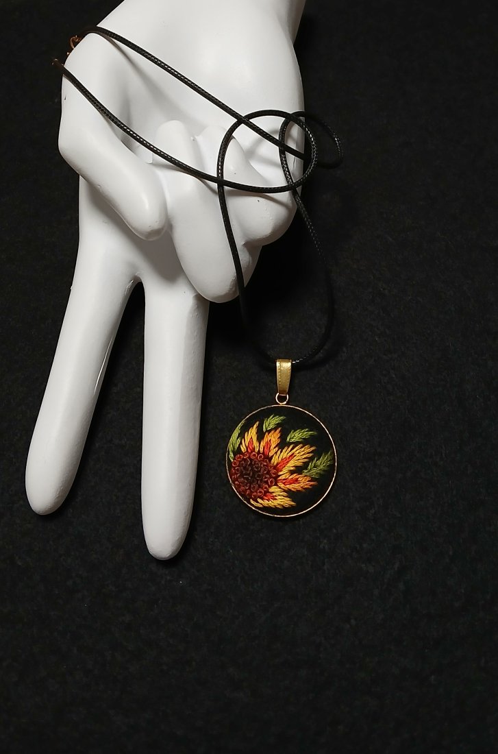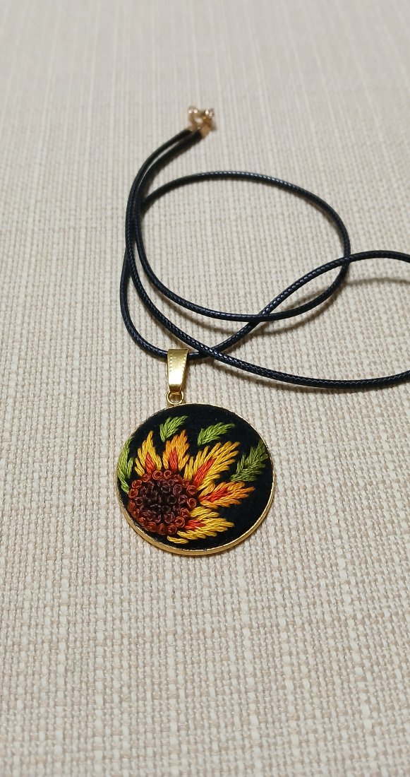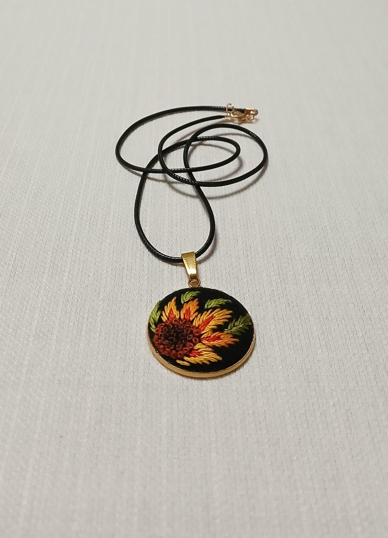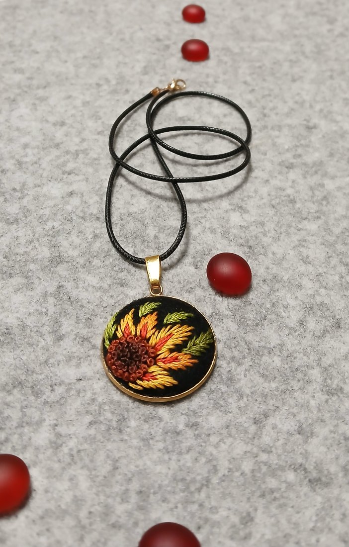 Niewielki, ręcznie haftowany wisiorek ze słonecznikiem w złotej bazie to biżuteria która sprawi że poczujesz się wyjątkowa. Autorski wzór, niespotykany design, kunsztowne wykonanie. Niepowtarzalność tkwi w każdym detalu.