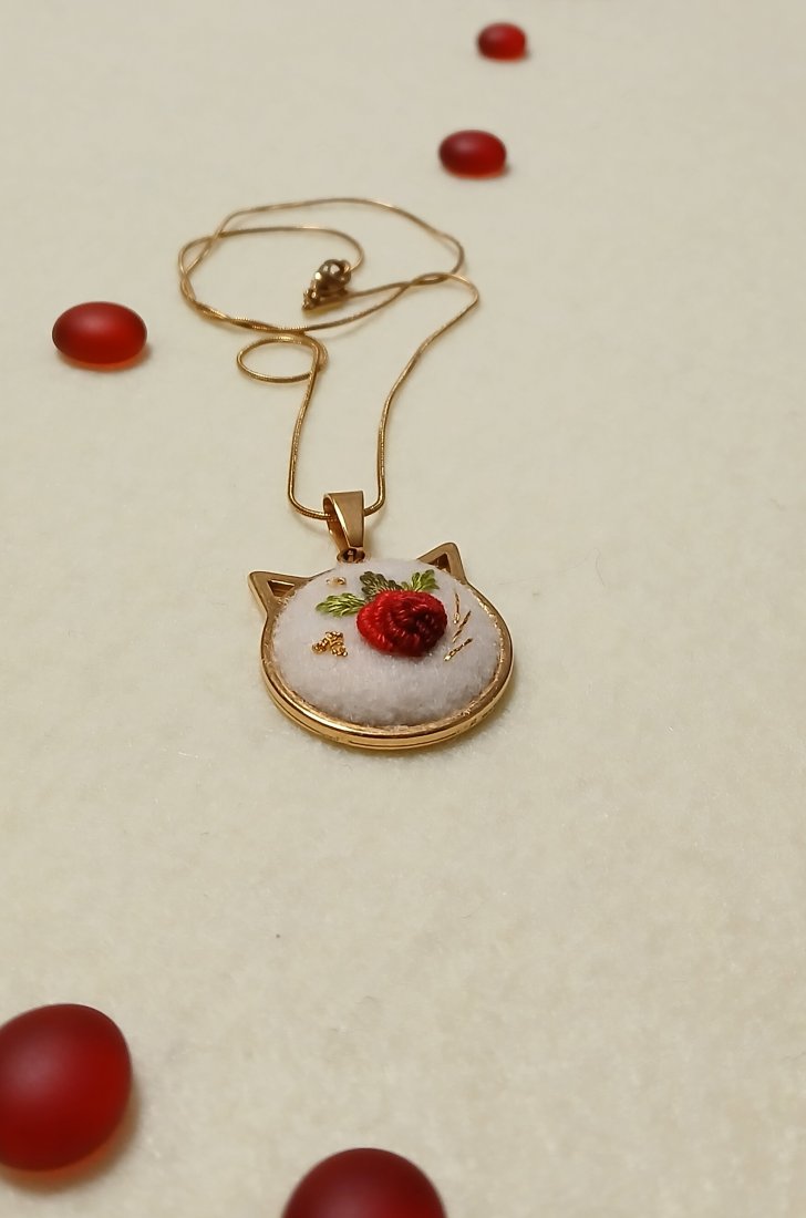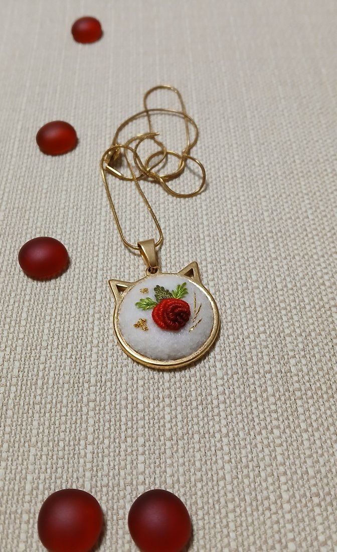 Klasyka kolorystyki - bordo na ecru z dodatkiem złota, ubrane w bazę ze stali szlachetnej w kolorze złota. Wisior jest lekki, nie odbarwia, nie uczula i zachowuje swój pierwotny kolor przez długi czas.