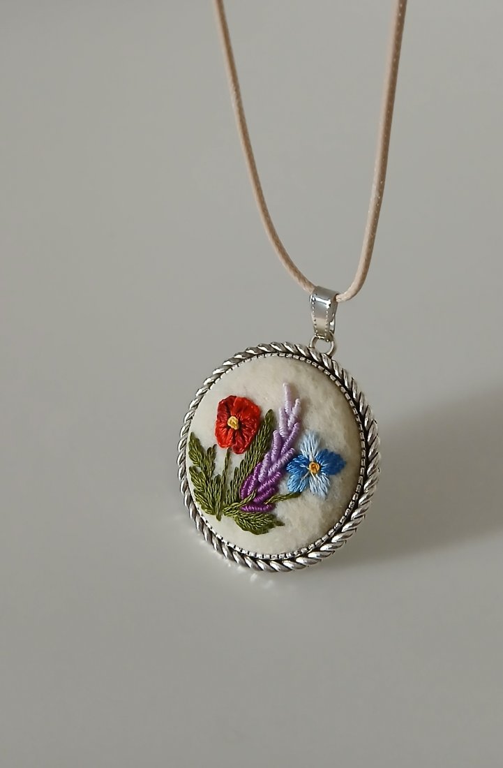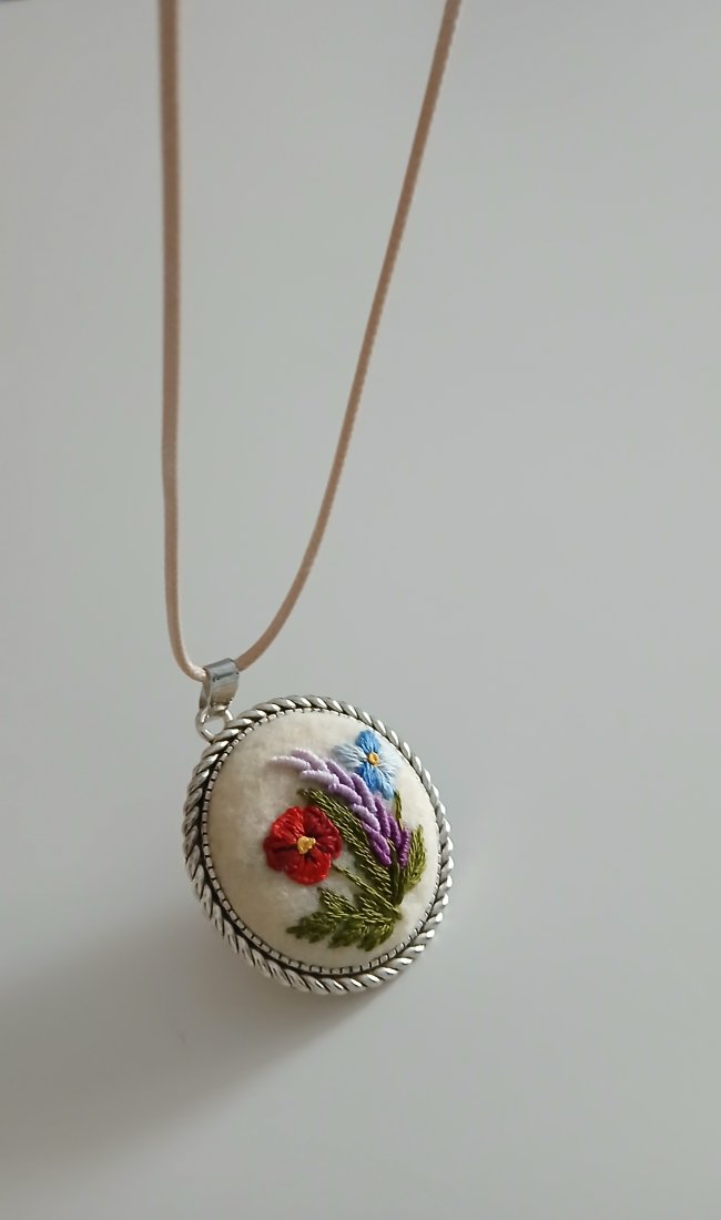 Perfekcyjnie dopracowany haft na filcu wykonałam polską bawełnianą muliną za pomocą igły. Jest on zabezpieczony impregnatem do tkanin ale po dłuższym użytkowaniu można go odświeżyć przy pomocy delikatnego mydła i letniej wody.