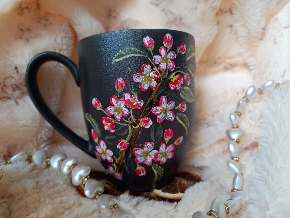 Ręcznie malowany kubek z gałązkami kwitnącej jabłoni.