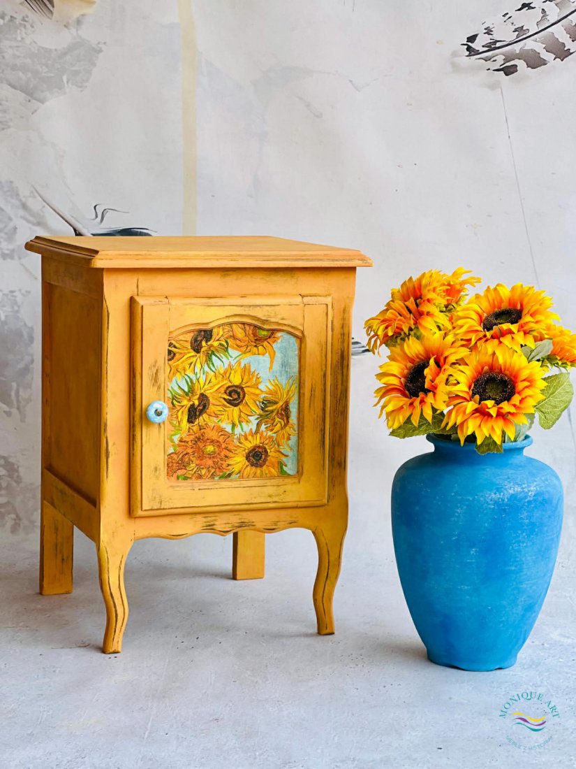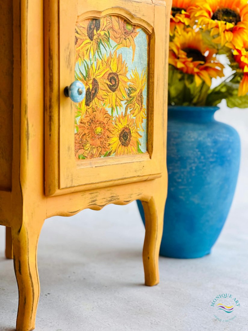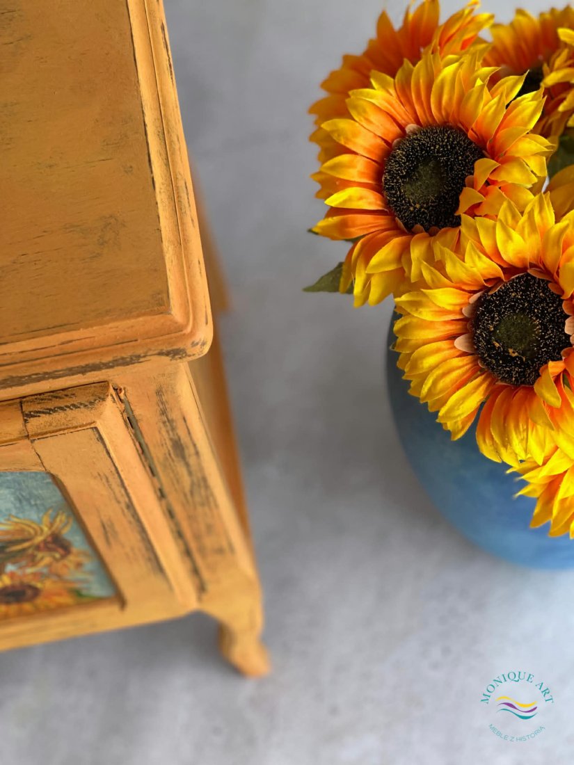 Szafka przy użyciu farb kredowych w odcieniach pomarańczu i żółci, które nadają jej słoneczny, energetyczny charakter. Delikatne przetarcia podkreślają styl vintage i artystyczną duszę mebla.