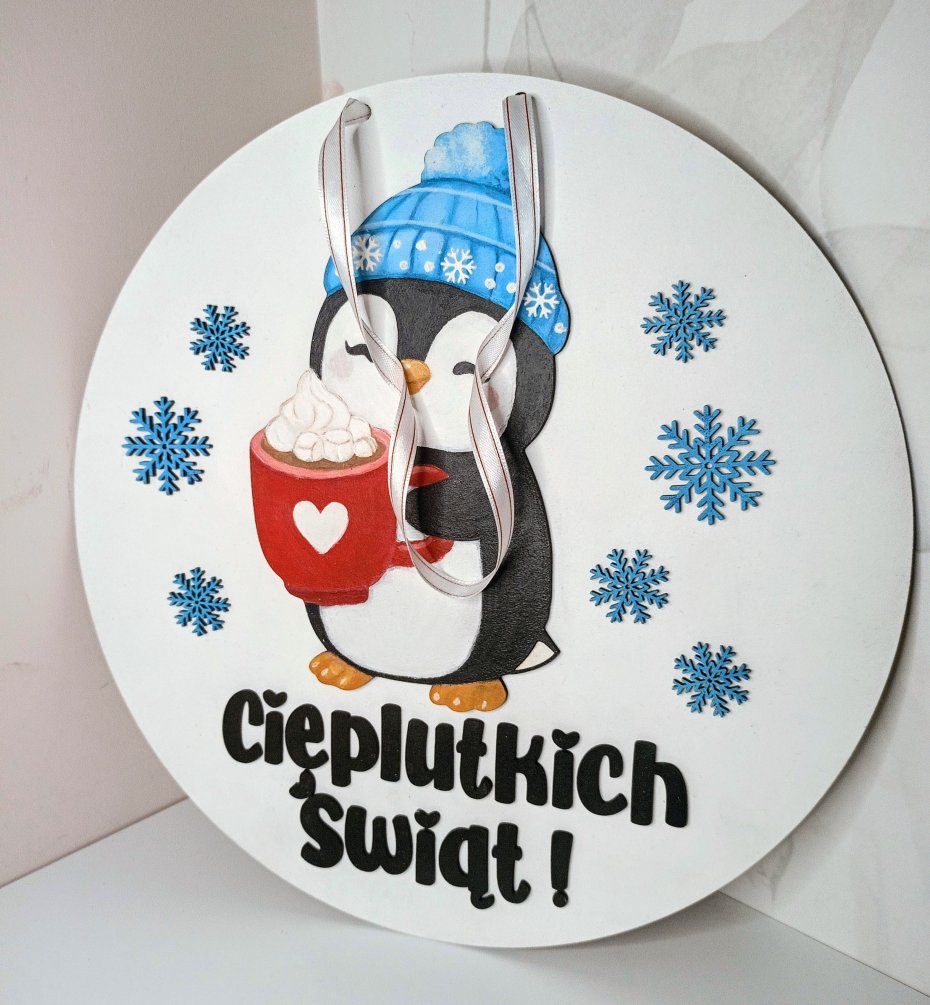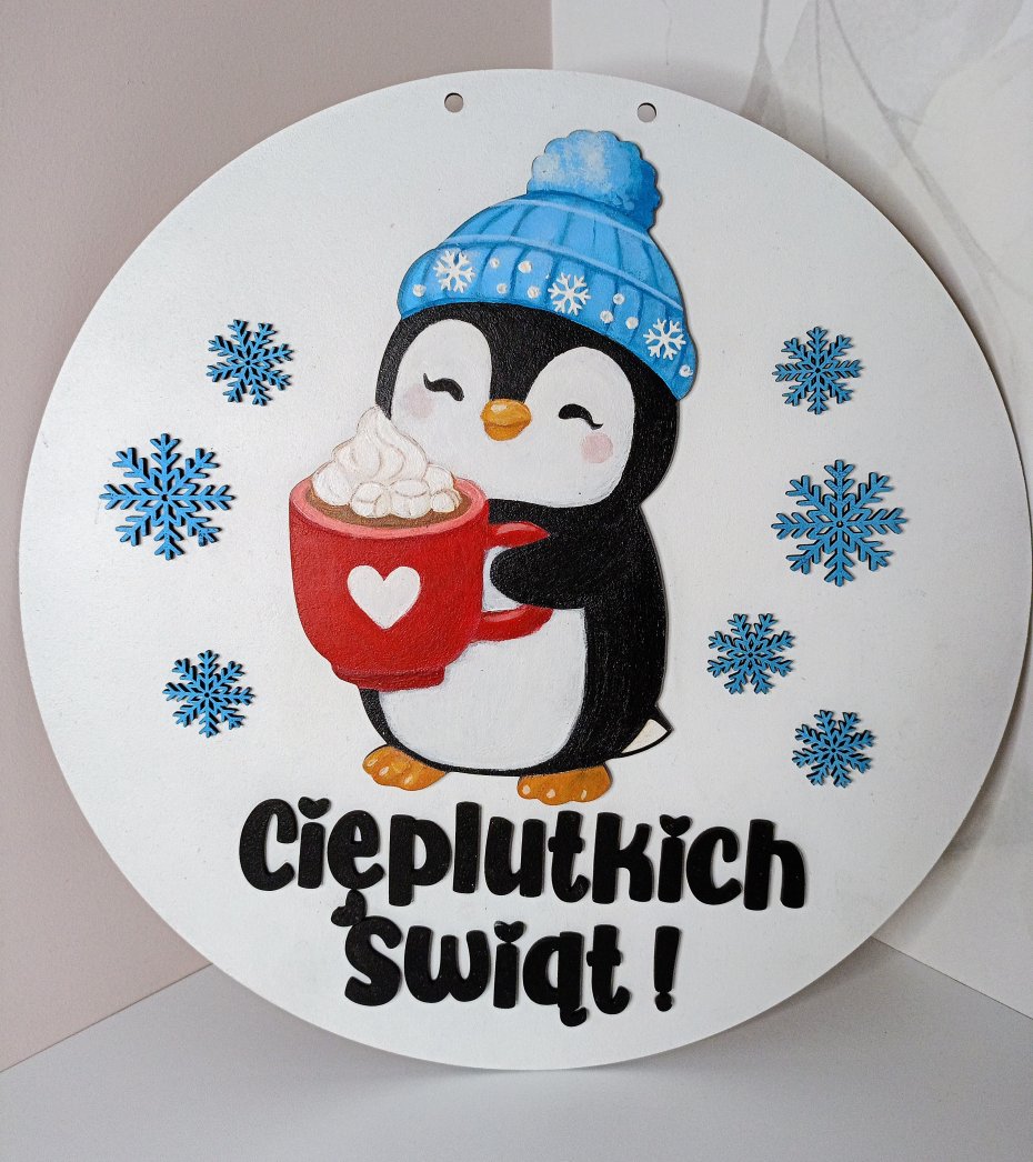 Oferuję Państwu unikatową, ręcznie wykonaną tablicę dekoracyjną, idealną do zawieszenia na drzwiach wejściowych, oknie lub ścianie. Stanowi ona elegancki, a zarazem ciepły akcent w zimowej aranżacji wnętrza, witając domowników oraz gości hasłem "Cieplutkich Świąt".