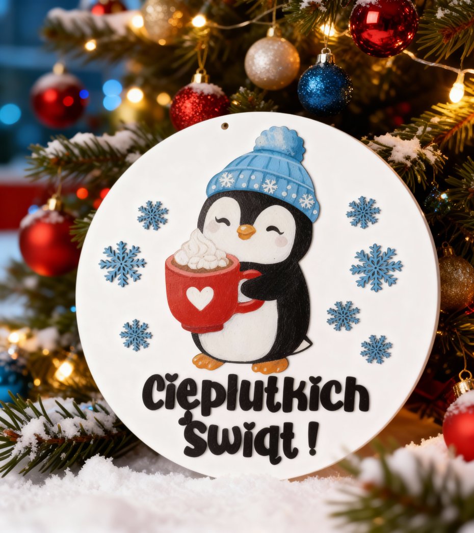 Wykonanie i Technika: Ilustracja malowana jest ręcznie przy użyciu wysokiej jakości profesjonalnych farb akrylowych renomowanej marki Renesans, co gwarantuje głębię koloru oraz odporność na blaknięcie. Całość kompozycji wzbogacają przestrzenne, wycinane elementy (napisy oraz płatki śniegu), które nadają ozdobie trójwymiarowy charakter.