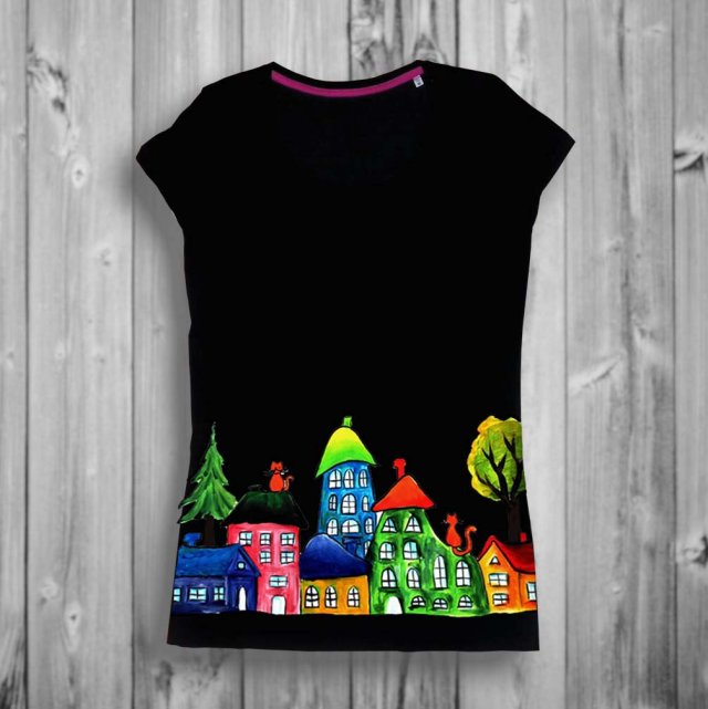 Ręcznie malowana, unikatowa, artystyczna bluzka uszyta z wysokogatunkowej czarnej bawełny typu ring-spun z dodatkiem elastanu, dzięki czemu koszulka nie straci fasonu nawet po wielu praniach i przyjemnie dopasuje się do Twojego ciała. Bluzka posiada kontrastującą taśmę z tyłu szyi, modny szeroki dekolt z wąskim ściągaczem, wąsko obrębione rękawy oraz wzmocniony szew na ramieniu. Motywy graficzne zostały namalowane ręcznie trwałą farbą do tekstyliów, odporną na spieranie i blaknięcie.