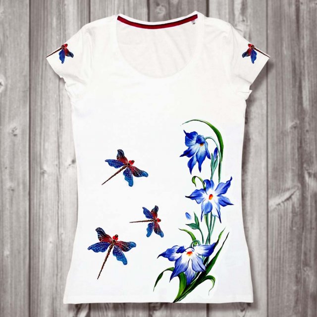 Ręcznie malowana, unikatowa, artystyczna bluzka uszyta z wysokogatunkowej białej bawełny typu ring-spun z dodatkiem elastanu, dzięki czemu koszulka nie straci fasonu nawet po wielu praniach i przyjemnie dopasuje się do Twojego ciała. Bluzka posiada kontrastującą taśmę z tyłu szyi, modny szeroki dekolt z wąskim ściągaczem, wąsko obrębione rękawy oraz wzmocniony szew na ramieniu. Motywy graficzne zostały namalowane ręcznie trwałą farbą do tekstyliów, odporną na spieranie i blaknięcie.