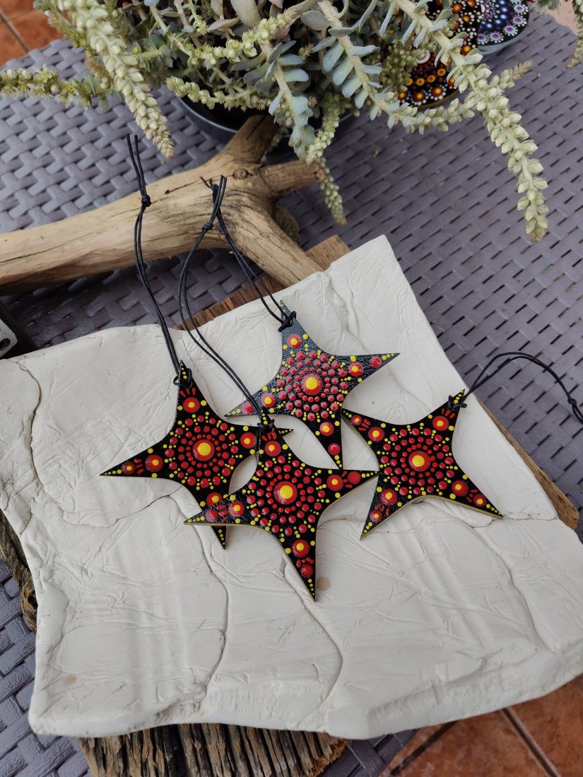 Ozdobne gwiazdki wykonane ręcznie i malowane techniką kropkowania (dot painting). Każda zawieszka jest unikatowa – zdobiona energetyczną mandalą w ciepłych odcieniach czerwieni, pomarańczu i żółci. Idealnie sprawdzi się jako dekoracja świąteczna, element wystroju domu lub prezent w rustykalnym, boho czy etnicznym stylu. Można zawiesić je na choince, w oknie, przy doniczkach lub jako ozdobę ścienną.