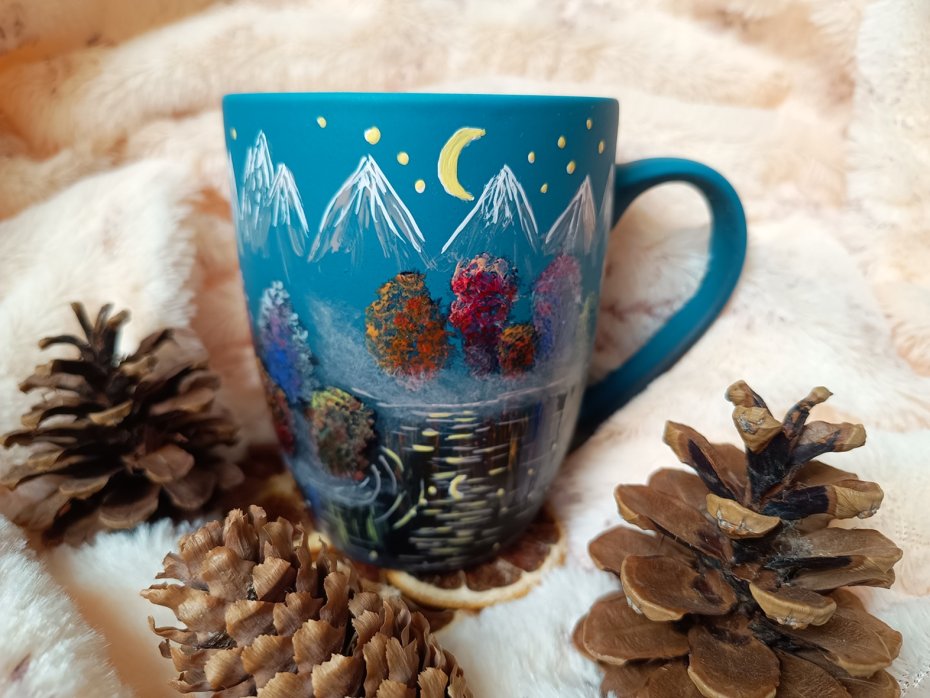 Kubek ręcznie malowany jesień w górach i nocne jesienne drzewa. Ksieżyc, gwiazdy i szyty gór górskie jezioro.