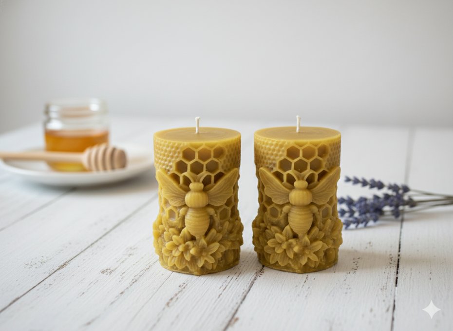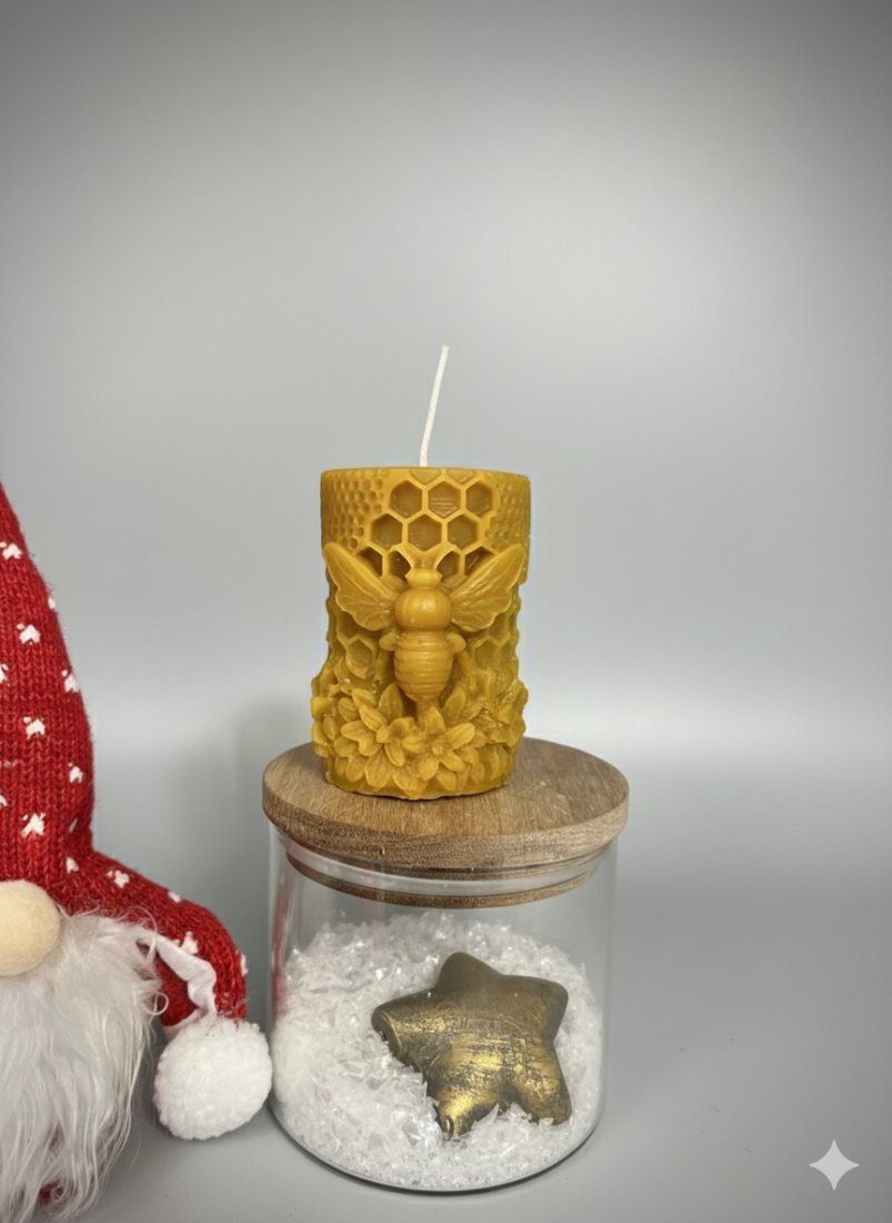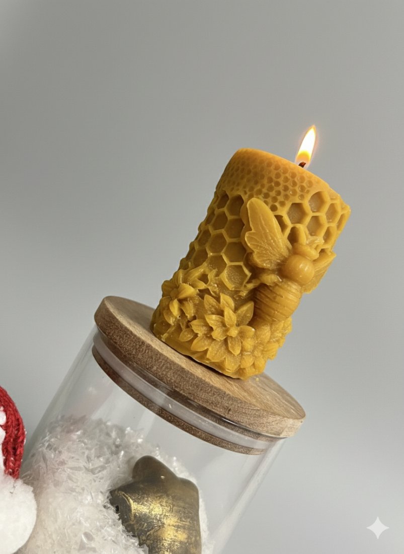 Świeca charakteryzuje się niezwykle precyzyjnym zdobieniem: centralną postacią jest wypukła pszczoła, otoczona misternym wzorem plastra miodu oraz delikatnymi kwiatami u podstawy. Ciepły, złocisty kolor wosku oraz jego naturalny, miodowo-propolisowy aromat stworzą w Twoim wnętrzu przytulną atmosferę.