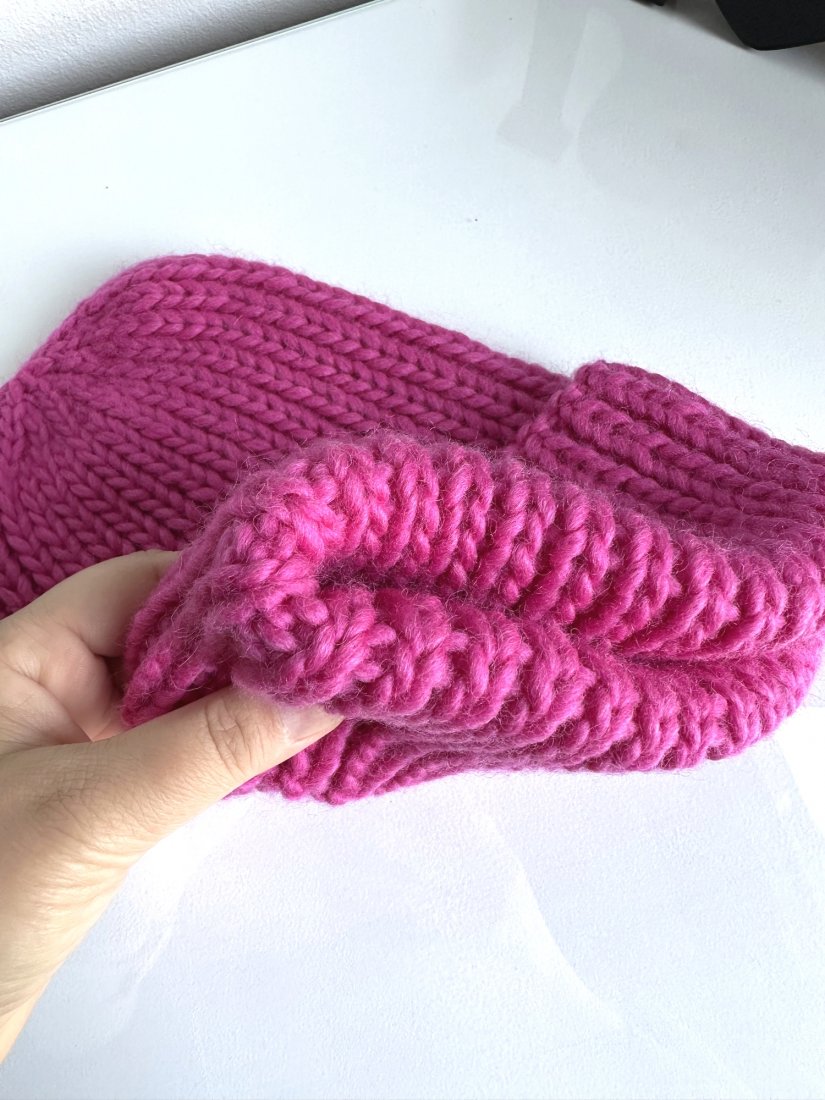 Duża, ciepła czapka ręcznie robiona na drutach. Idealna jako czapka zimowa. Gruba, solidna, ale delikatna i miła. Jeśli szukasz subtelniejszej wersji, postaw na czapki 100% merino.