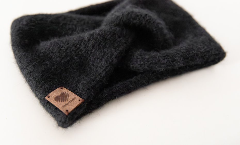 Opaska jest wykonana przeze mnie na drutach z włóczki Air Drops o składzie z metki: 65% Alpaca, 28% Polyamide. 7% Wool.