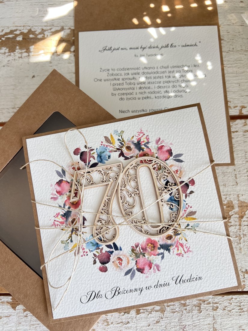 Kartka na urodziny wykonana na bazie papieru kraftowego z dodatkiem papieru bawełnianego, nadrukiem stylowej akwareli oraz tekturkowej ozdoby - dwuwarstwowych cyfr. W zestawie z pudełkiem z okienkiem.