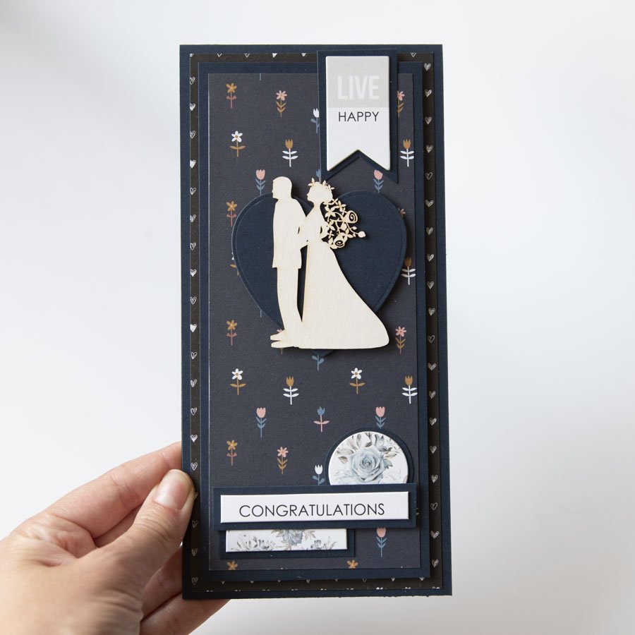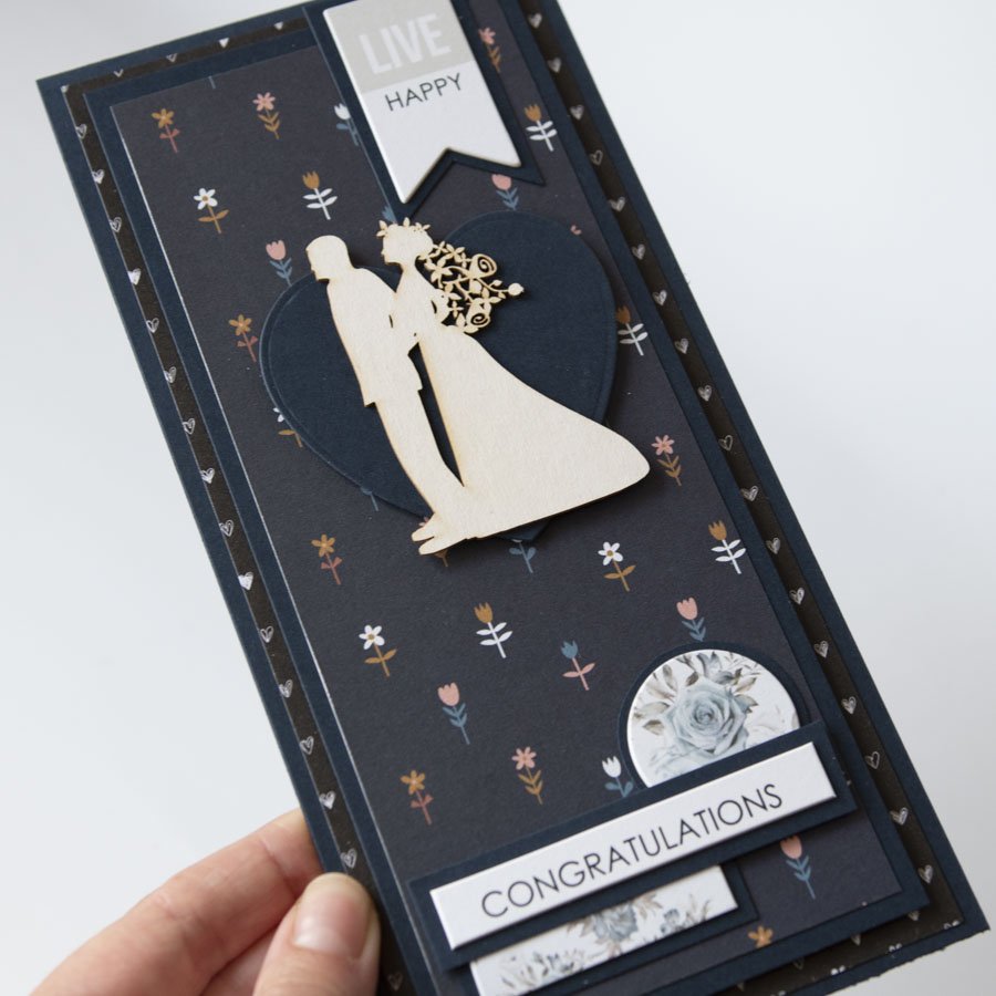 Ręcznie robiona kartka ślubna w odcieniach granatu z napisami w języku angielskim