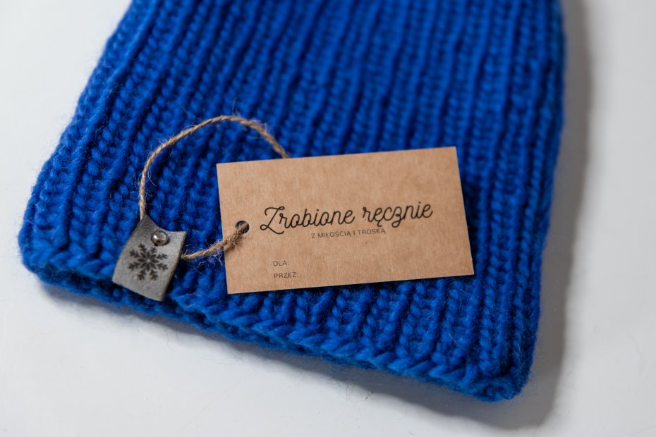 Do czapki załączam papierową metkę z napisem "Zrobione ręcznie".
