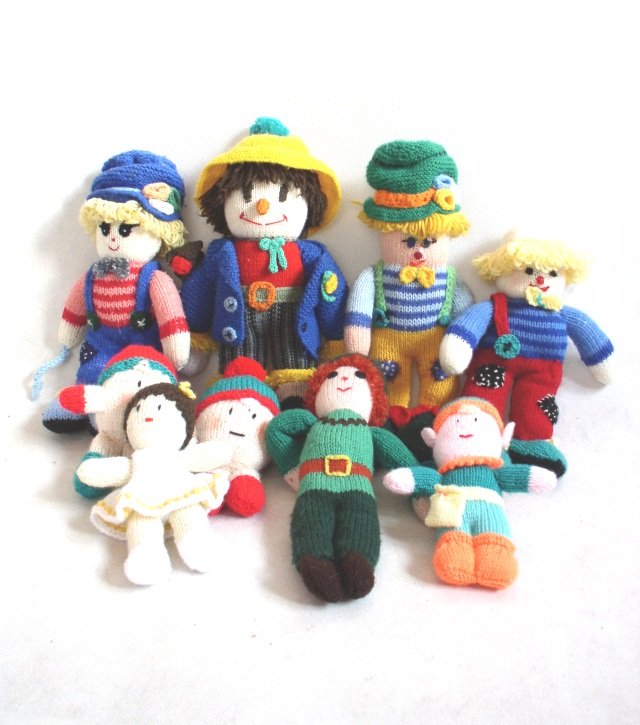 Lalki ręcznie robione na drutach.W zestawie pięć większych+cztery mniejsze.Stan dobry+niektóre wymagają odświeżenia..Największa lalka wysokości 37 cm.najmniejsza 19 cm.