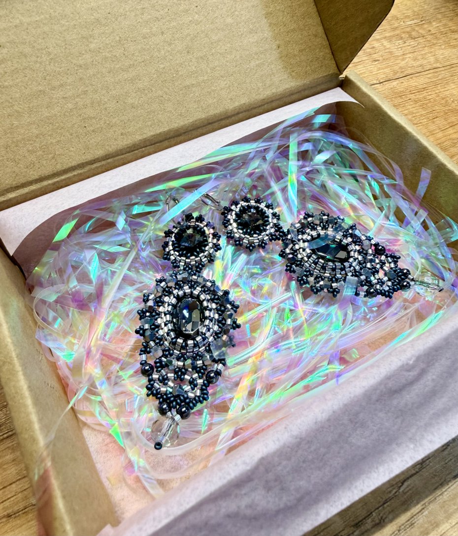Połączenie drobnych koralików z połyskującymi kryształkami tworzy wyrafinowaną formę, która pięknie odbija światło i dodaje stylizacji klasy.