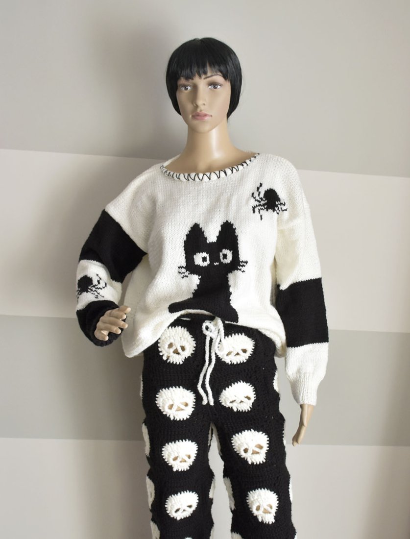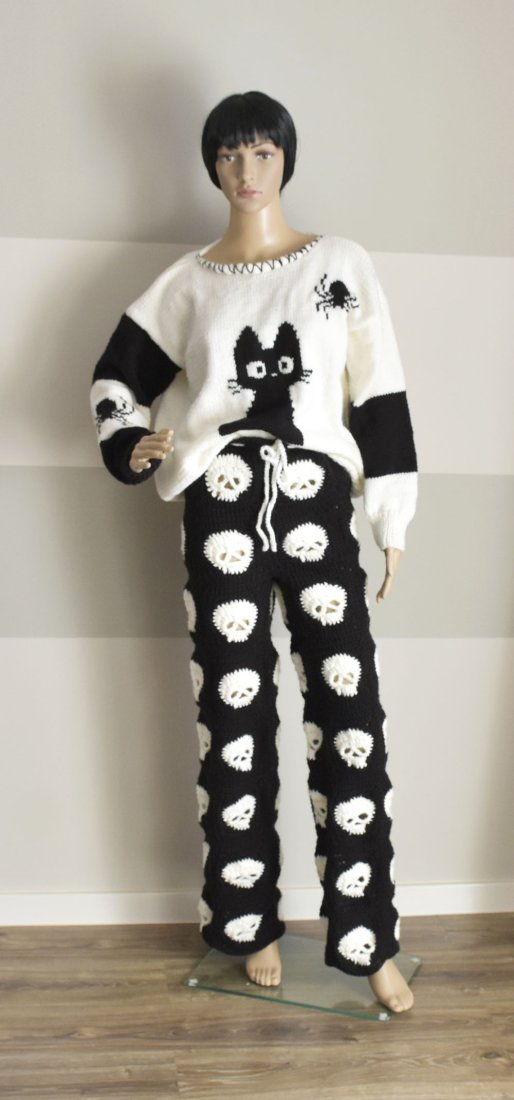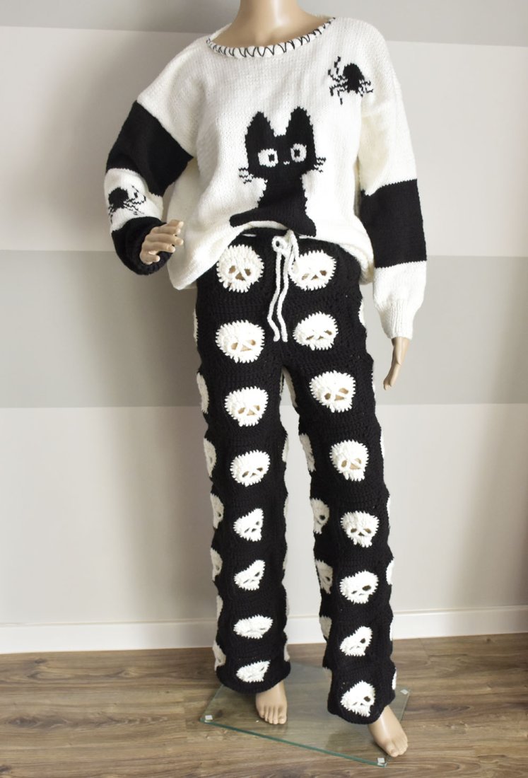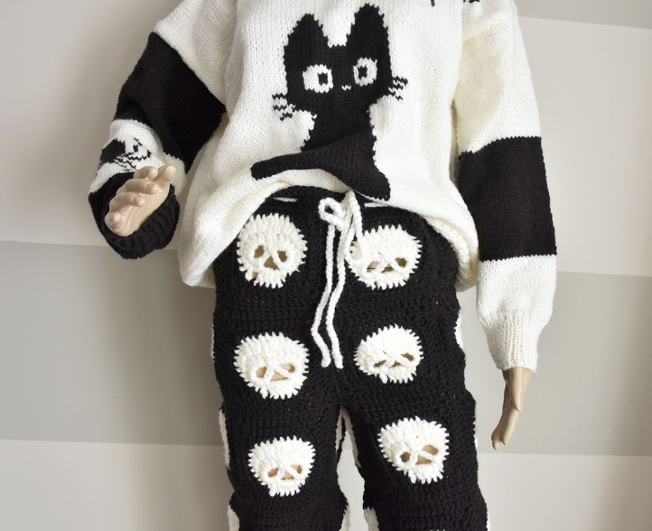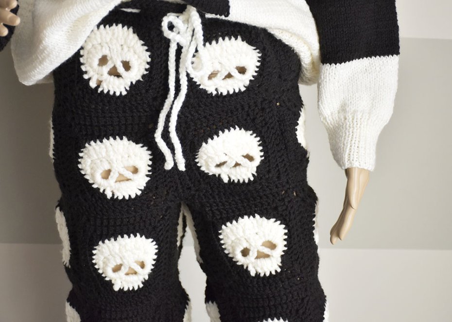 Ręcznie robione spodnie szydełkowe z czaszkami