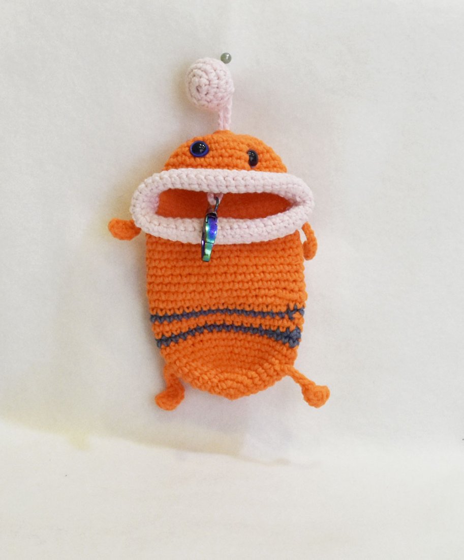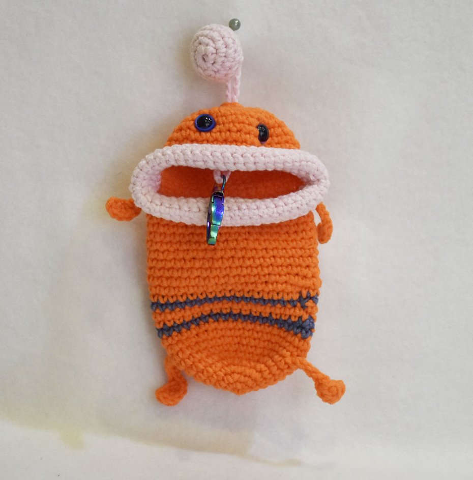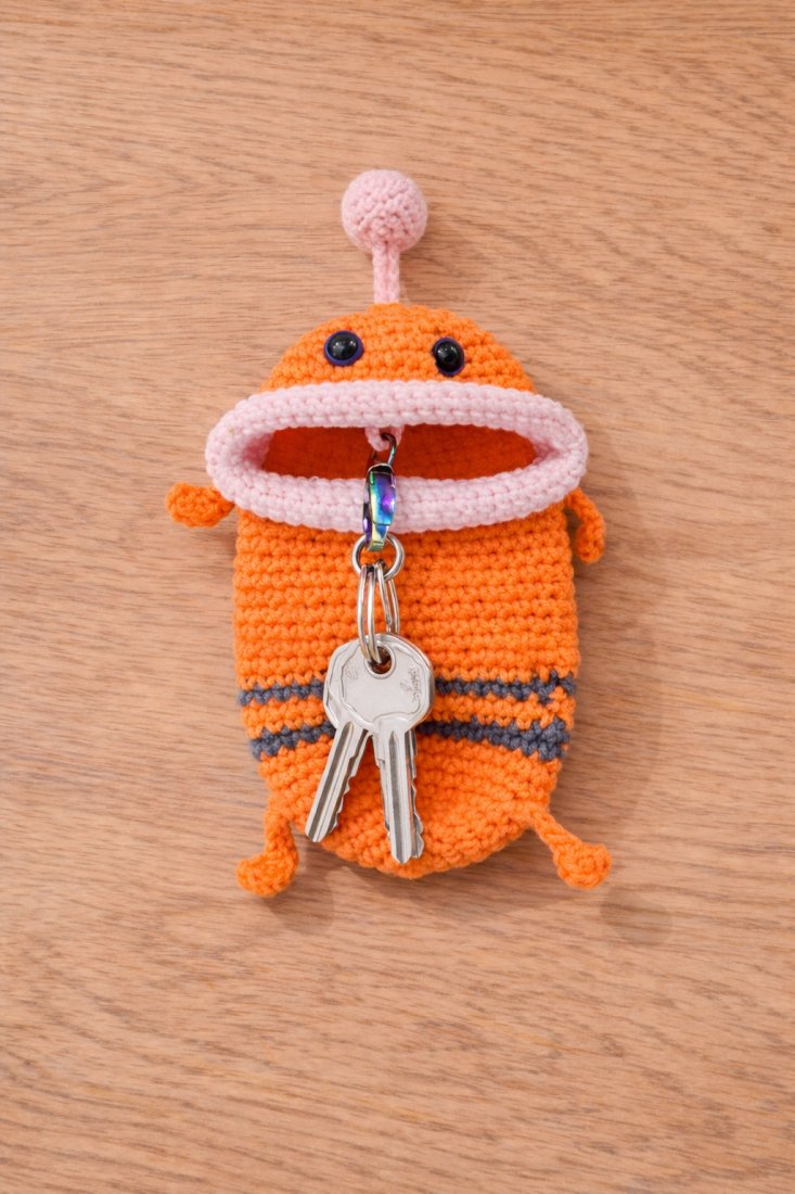 Ręcznie wykonany breloczek pełniący funkcję praktycznego schowka na klucze. Miękka, szydełkowa forma skutecznie chroni klucze przed zarysowaniami i hałasem w torebce lub plecaku. Otwierany schowek z metalowym karabińczykiem pozwala bezpiecznie przypiąć klucze w środku, a całość można wygodnie przypiąć do torby, paska lub plecaka. Wyraziste kolory i charakterystyczny wygląd sprawiają, że breloczek jest nie tylko praktyczny, ale też stanowi oryginalny dodatek.
