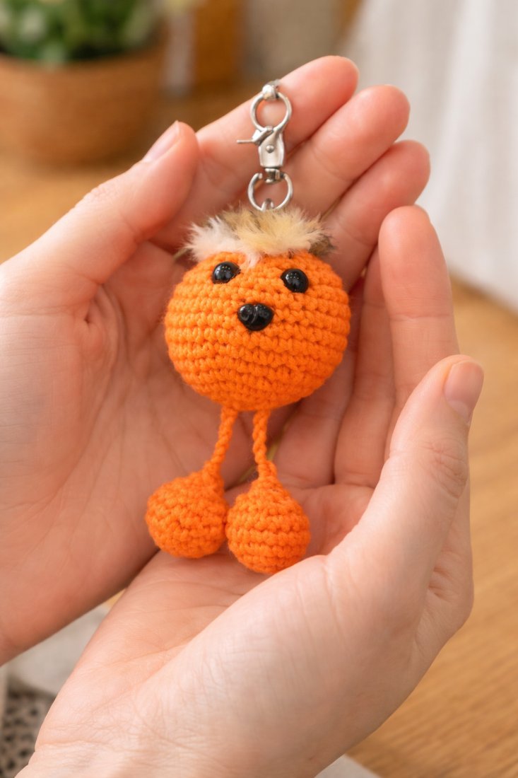 Uroczy, ręcznie robiony breloczek szydełkowy w intensywnym pomarańczowym kolorze.