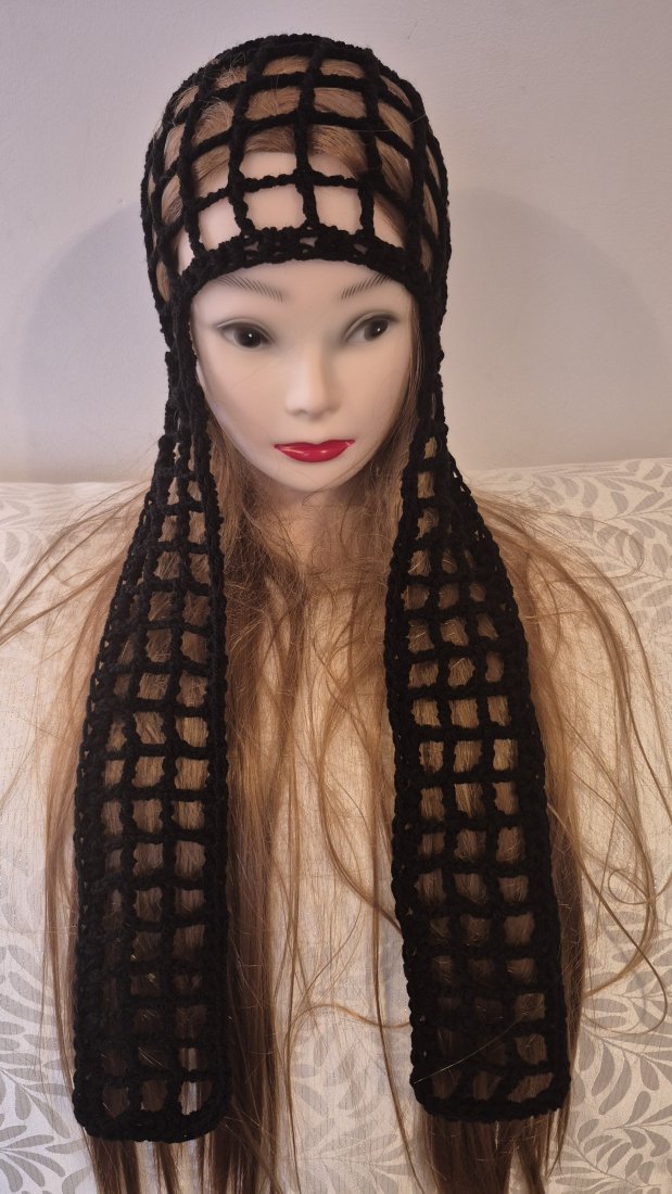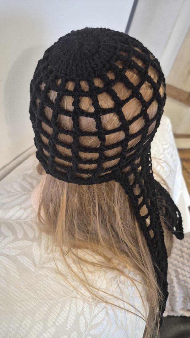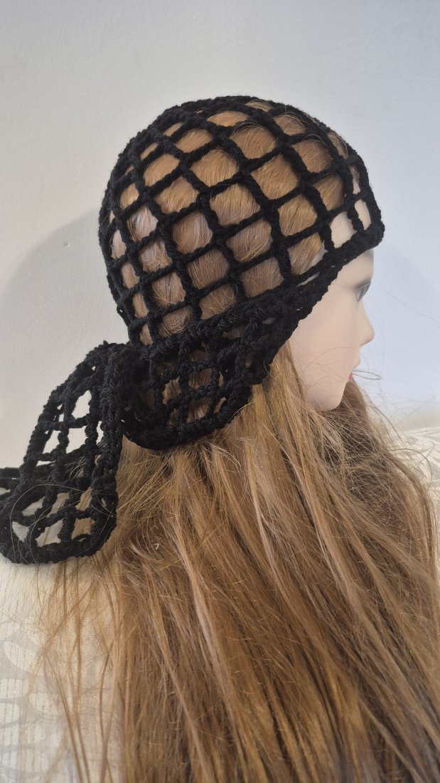 Na sprzedaż oferuję wyjątkowy, ręcznie wykonany czepiec o strukturze siatki (mesh) w kolorze głębokiej czerni. To absolutny must-have dla osób, które szukają niebanalnych dodatków i chcą wyróżnić się z tłumu.