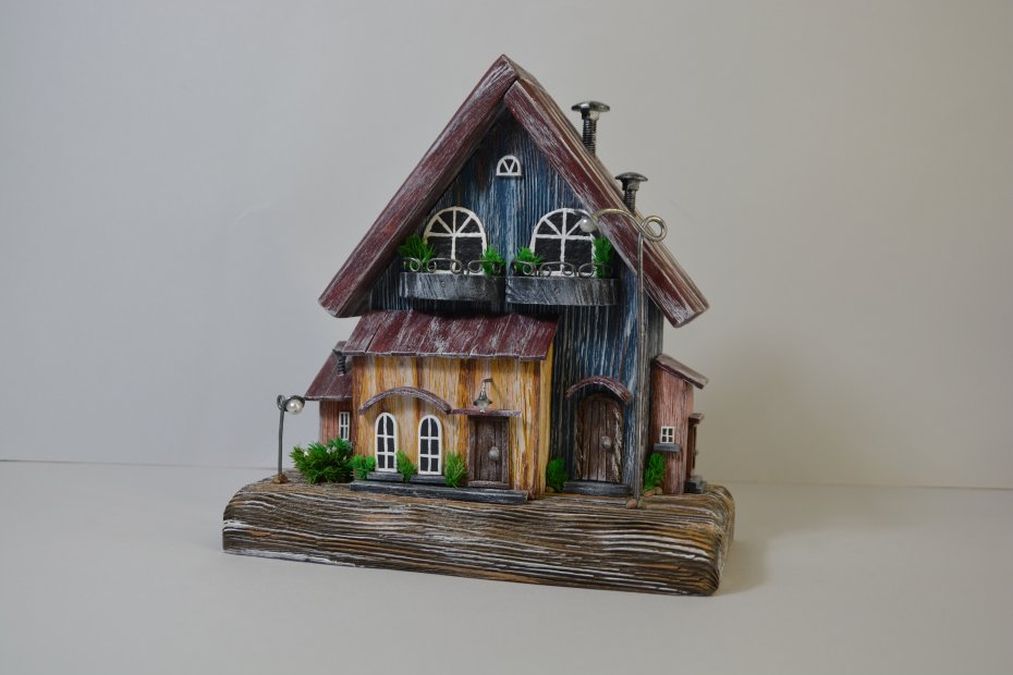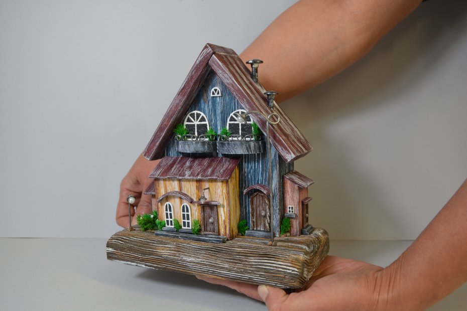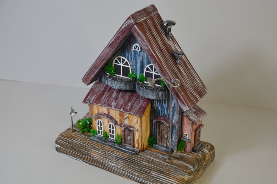 Ten ręcznie wykonany domek z drewna to wyjątkowa dekoracja, która wprowadza ciepły, bajkowy klimat do każdego wnętrza. Starannie wykonany z naturalnych materiałów, ozdobiony drobnymi detalami – okienkami, balkonami i mini roślinkami. Idealny jako ozdoba półki, komody czy parapetu. Świetny pomysł na prezent dla miłośników natury i stylu rustykalnego.