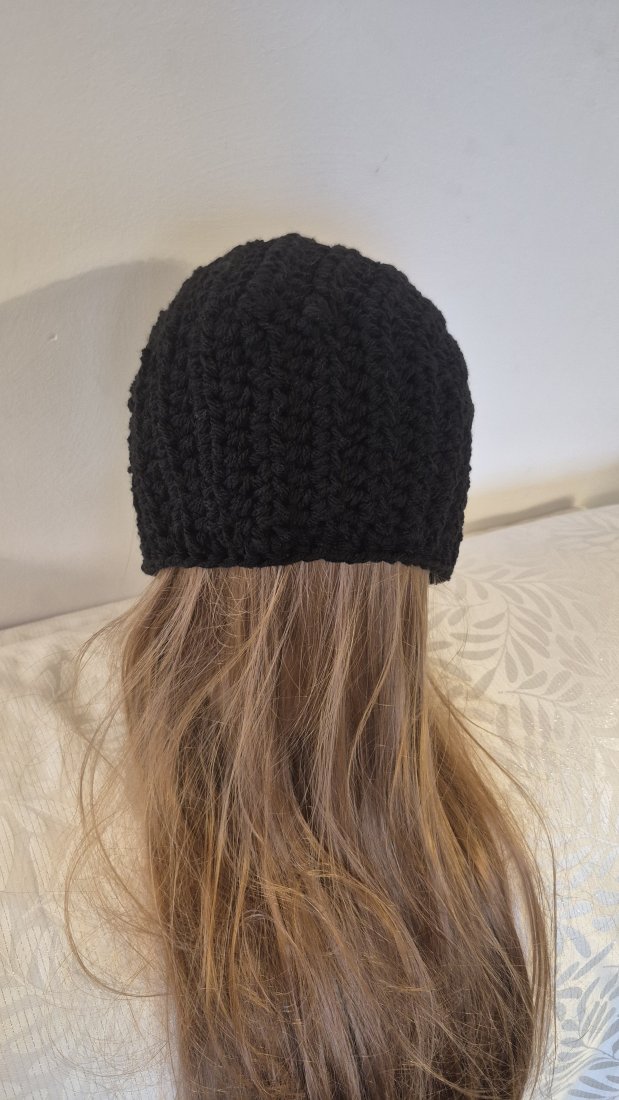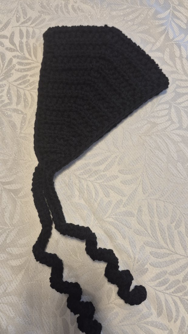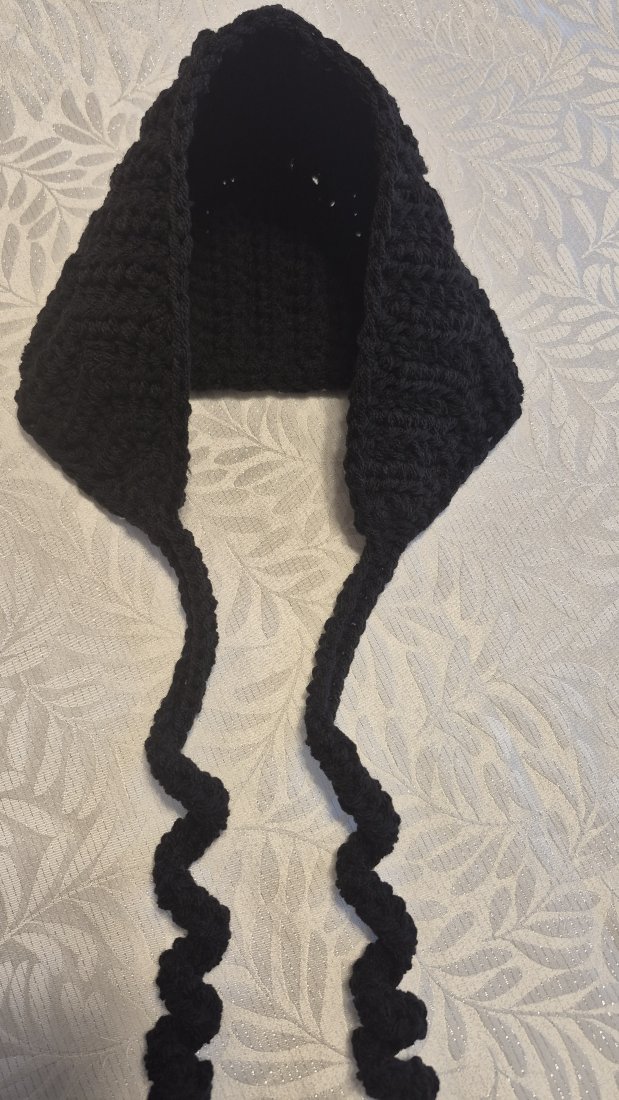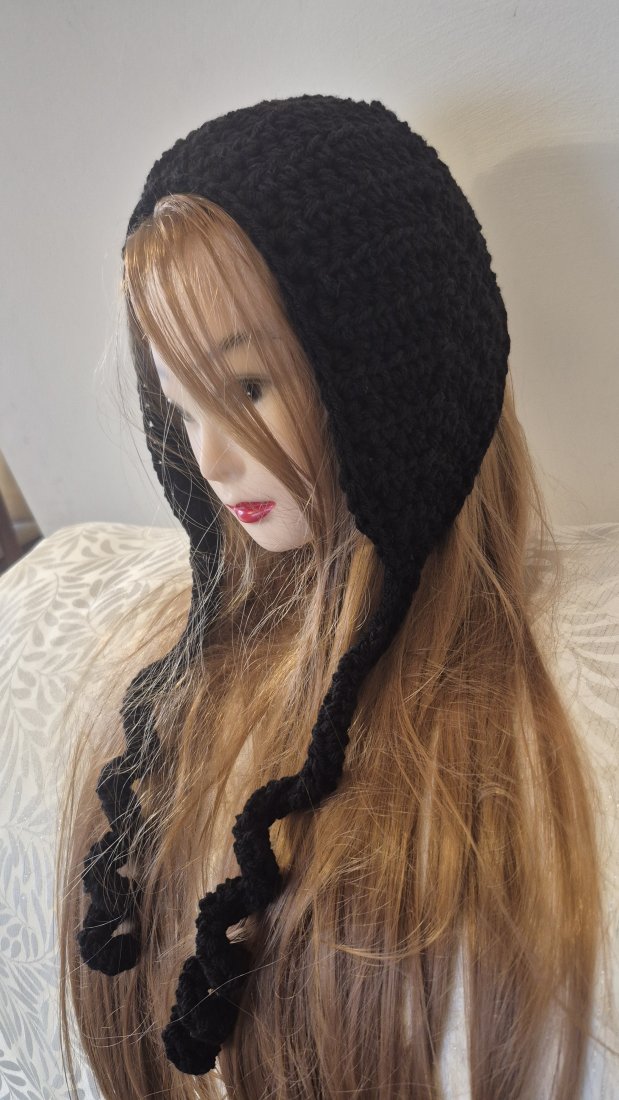 Przedstawiam ręcznie wykonany na szydełku kapturek typu bonnet w klasycznym, głębokim czarnym kolorze. To idealne połączenie modnego designu "balaclava style" z dziewczęcym urokiem tradycyjnych czepków.