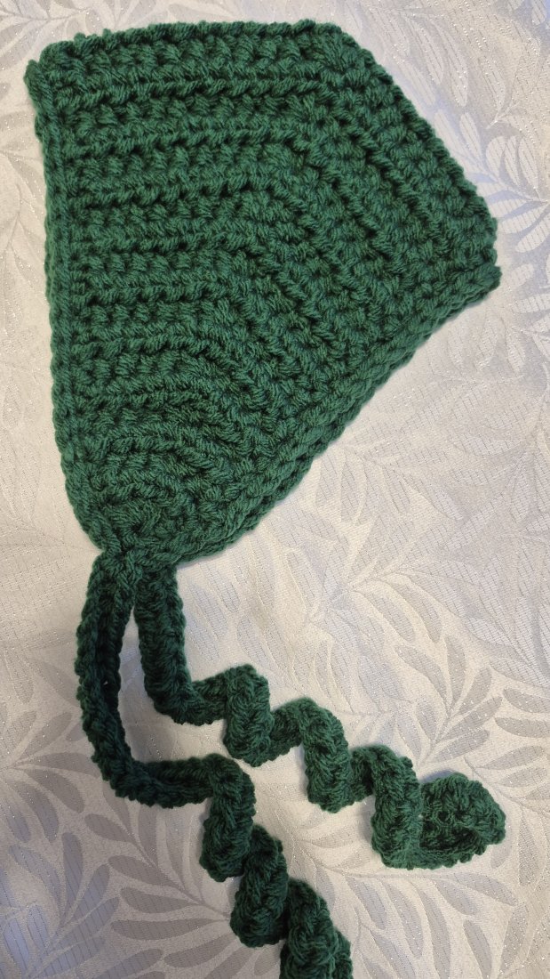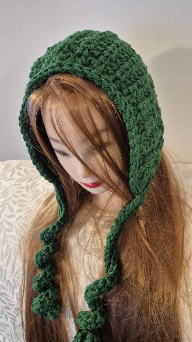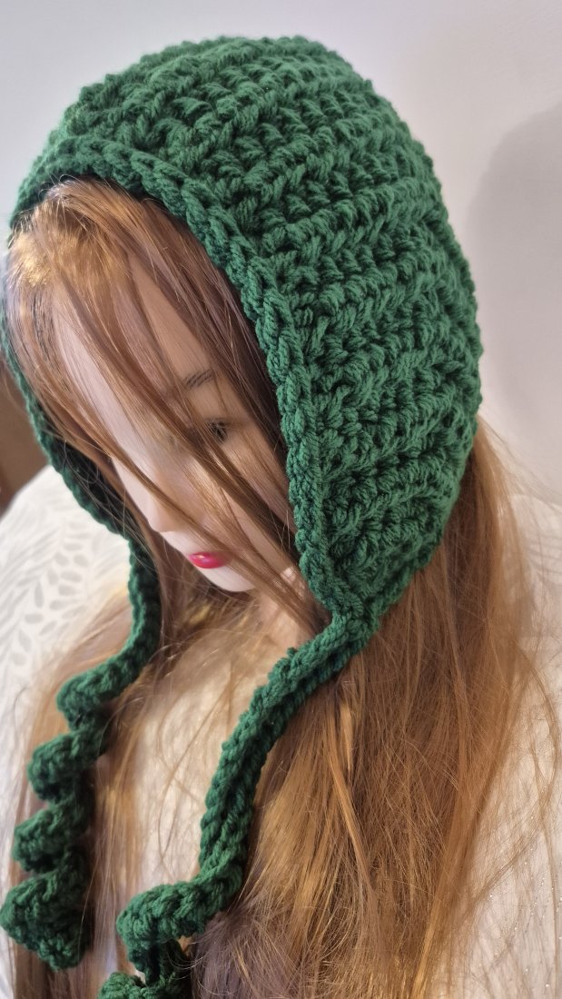 Przedstawiam ręcznie wykonany na szydełku kapturek typu bonnet w kolorze zielonym.To idealne połączenie modnego designu "balaclava style" z dziewczęcym urokiem tradycyjnych czepków.