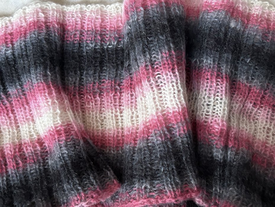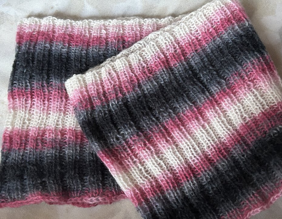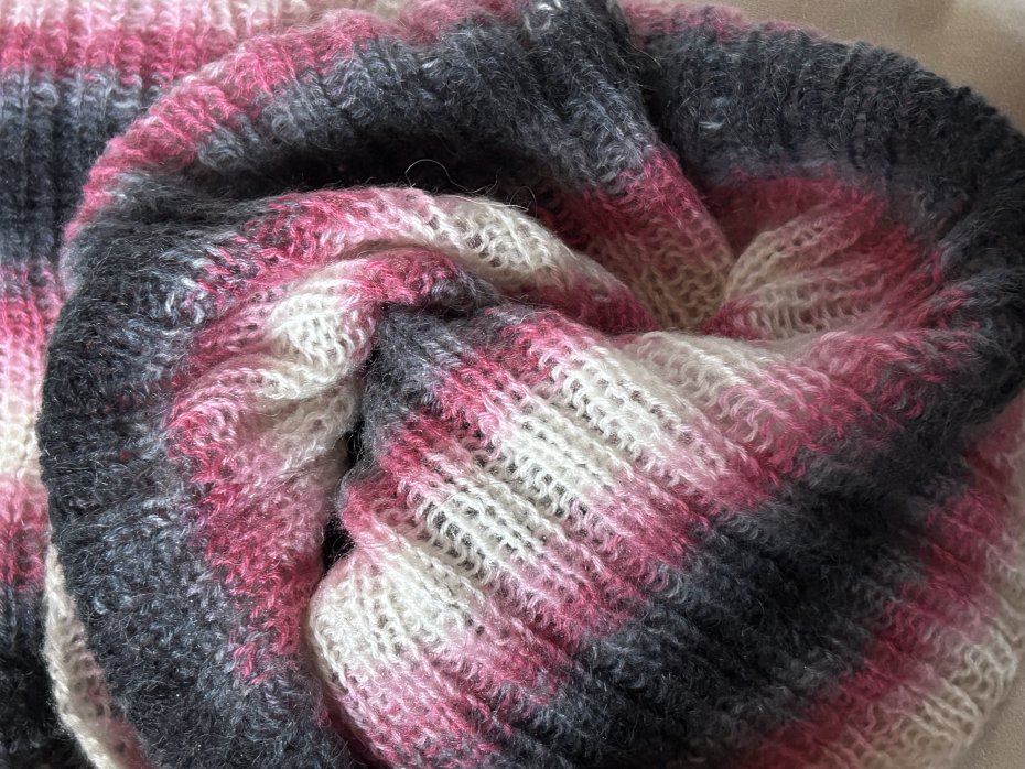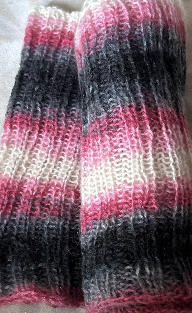Ręcznie robiony , rozciągliwy komin. Miły w dotyku . Piękne stopniowanie szarości i różu , szczypta ecru. 23 cm x bez rozciągania 43 cm Stan zachowania bardzo dobry .