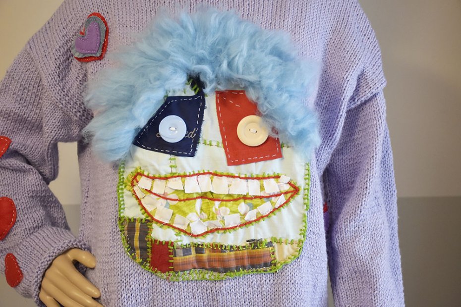 Na przodzie duża kolorowa aplikacja z włóczki i tkanin, ozdobiona guzikami i włochatym detalem.