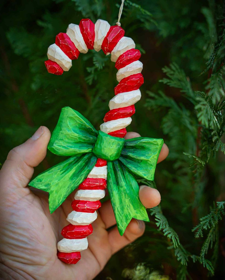 Ta wyjątkowa, ręcznie rzeźbiona ozdoba świąteczna w kształcie klasycznej cukrowej laski została wykonana z naturalnego drewna i starannie pomalowana, aby podkreślić każdy detal. Czerwono-białe pasy nadają jej tradycyjny, bożonarodzeniowy charakter, a duża zielona kokarda dodaje elegancji i przyciąga wzrok. To dekoracja, która wprowadza do wnętrza prawdziwy świąteczny klimat.