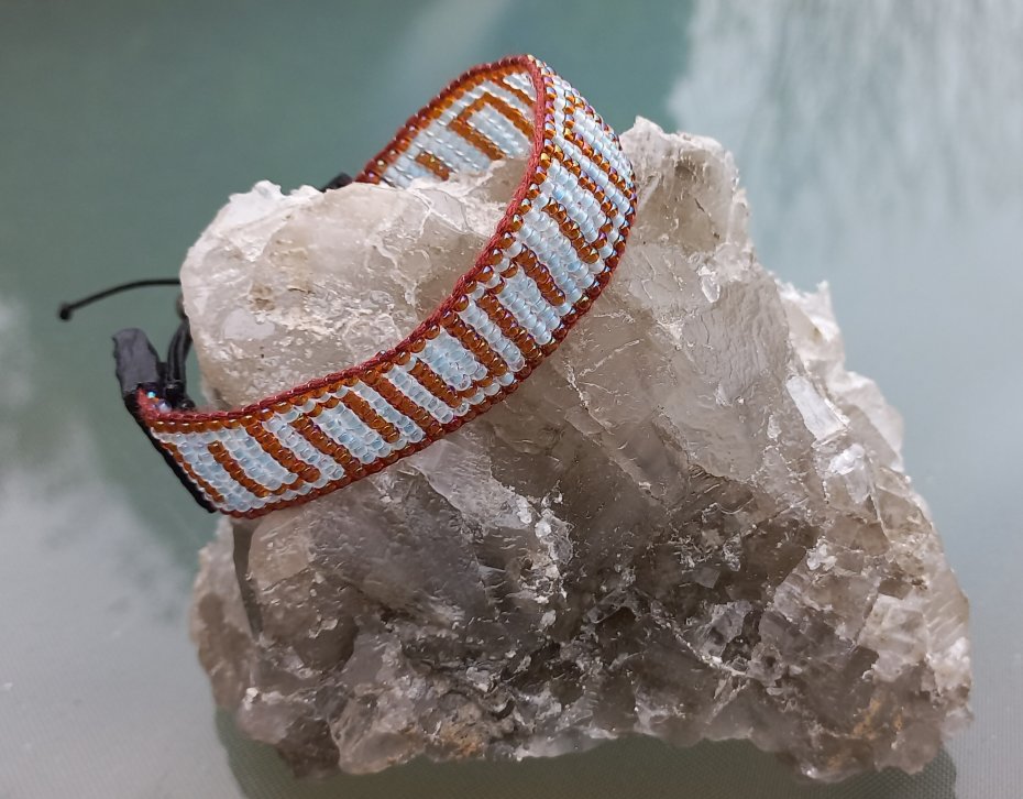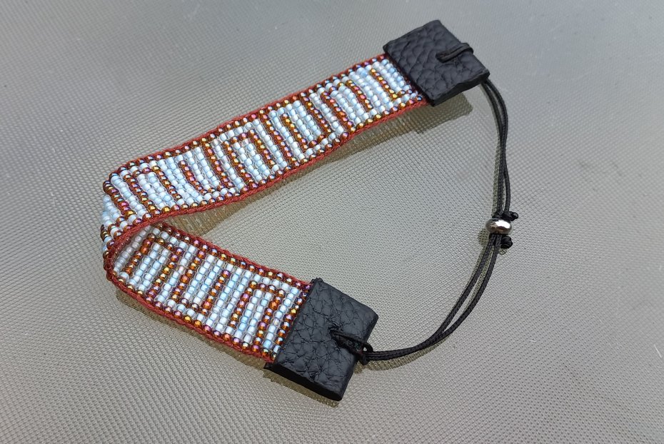 Tagi: #bransoletka tkana na krośnie, #dla niej dla niego na prezent, #szeroka bransoletka rękodzieło, #szklane koraliki skóra handmad