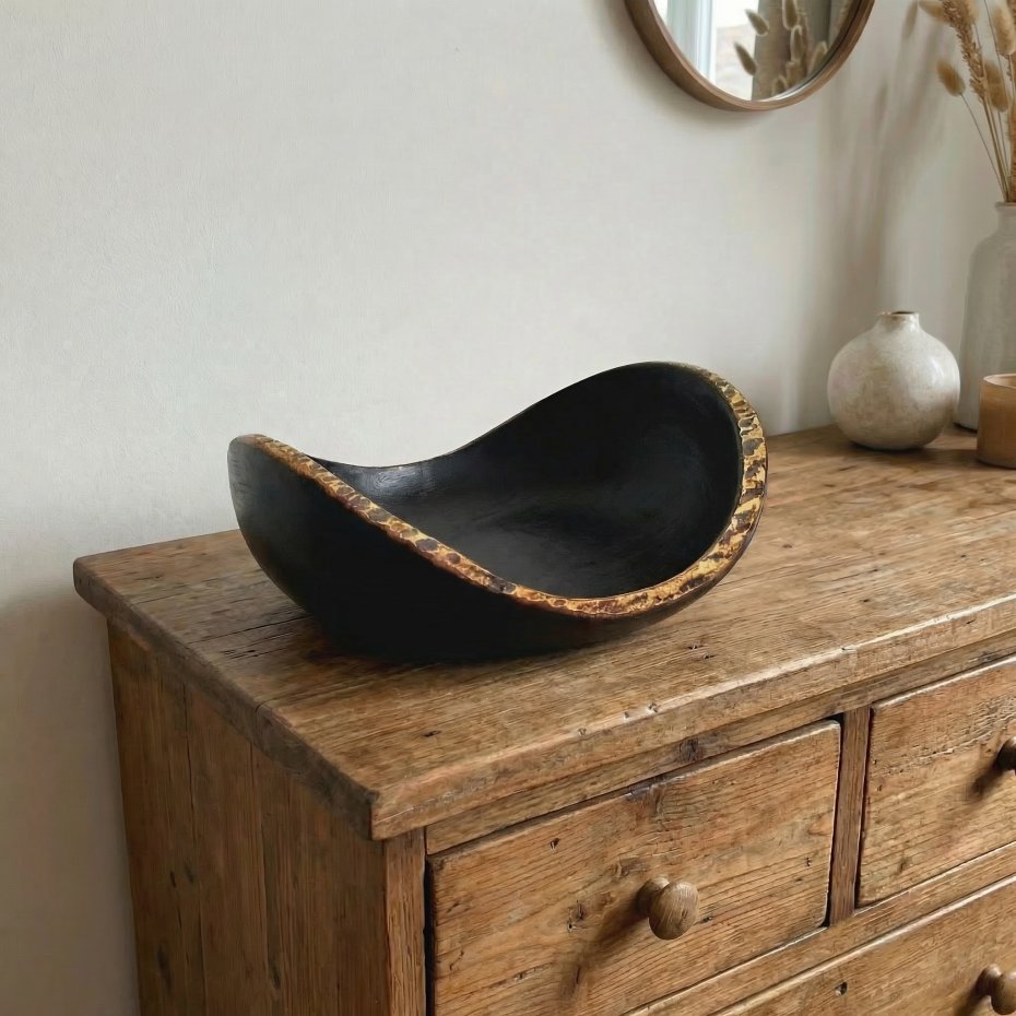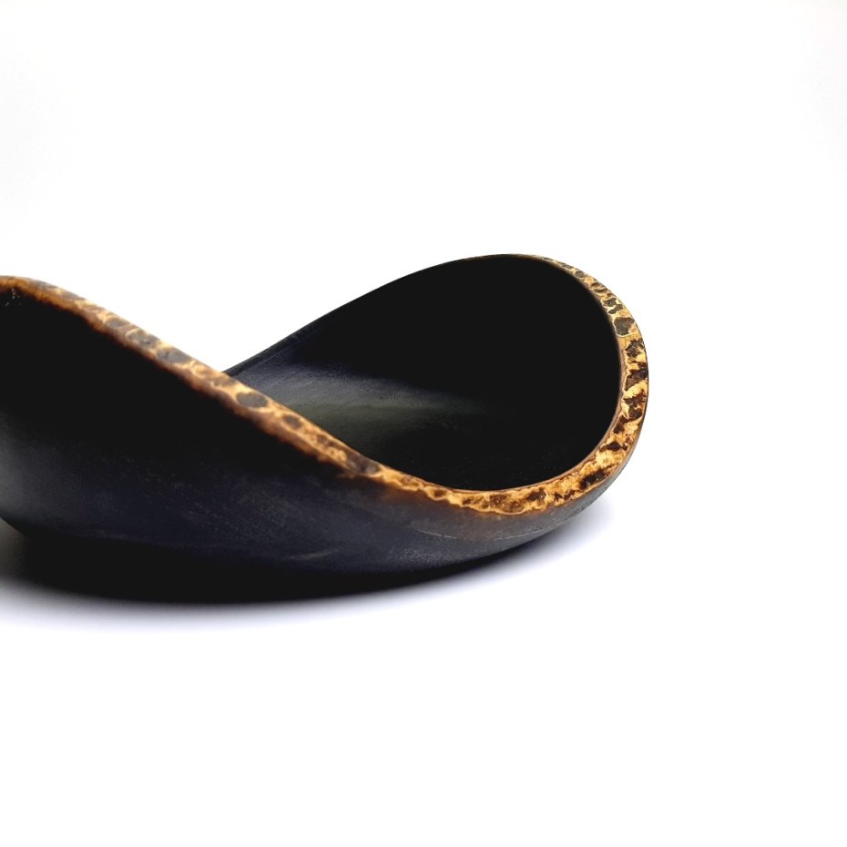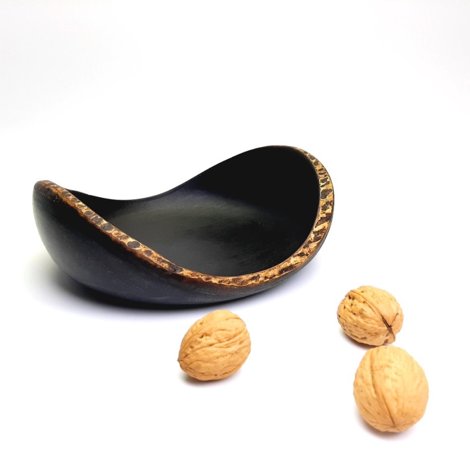 Prezentujemy unikatową misę wykonaną z litego drewna orzecha włoskiego, która stanowi studium kontrastów. Technika opalania drewna pozwoliła na wydobycie głębokiej, matowej czerni, która intrygująco koresponduje z naturalnym, ciepłym rysunkiem słojów.