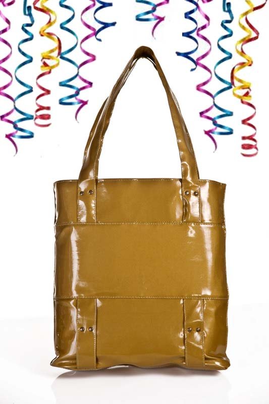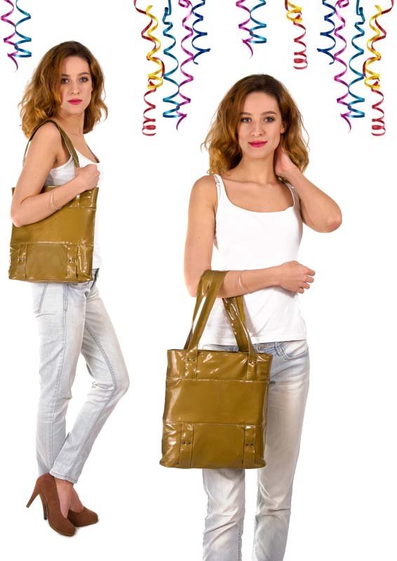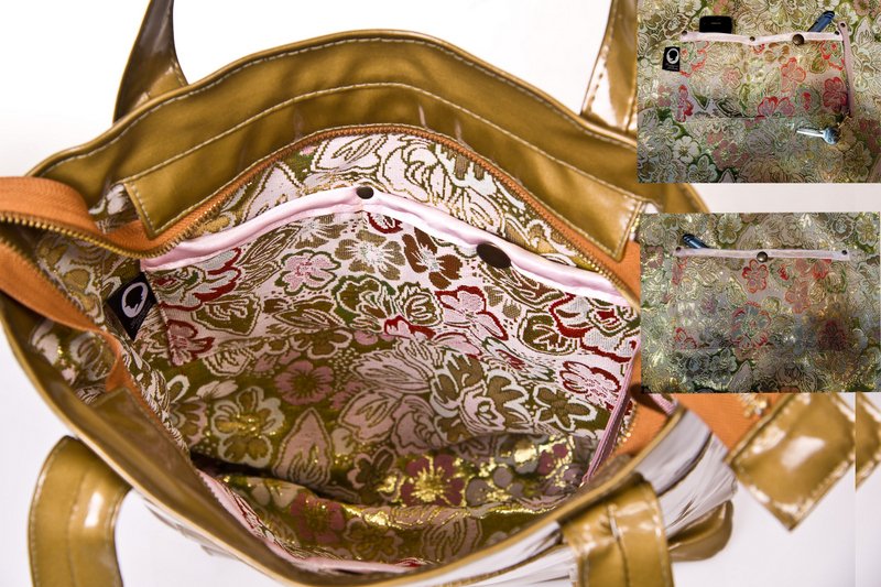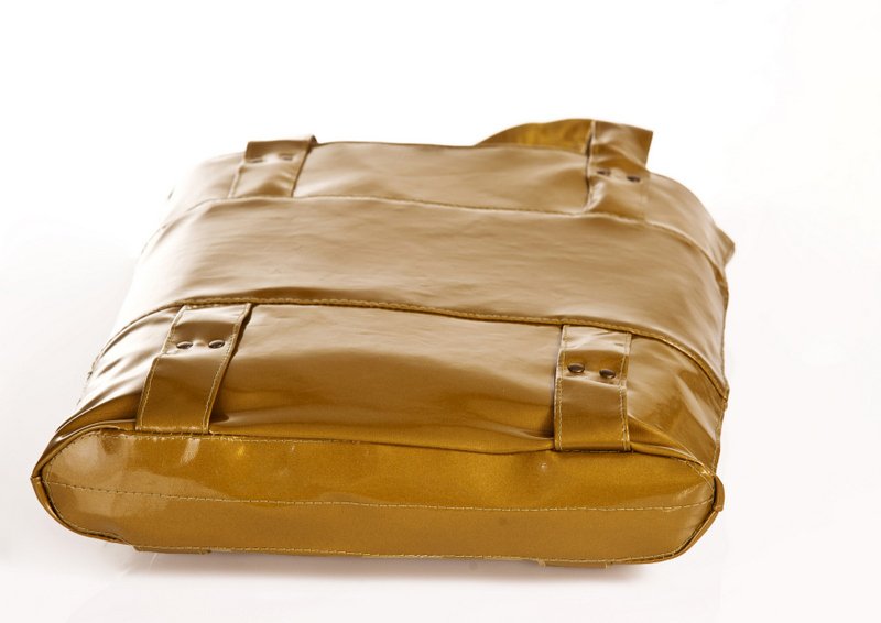 Torebka wykonana ze złotej eko-skóry. Przedzielona na 3 poziome części. Na dwóch rączkach z eko-skóry, wzmocnionych gumowo-plastikowym pasem. Rączki rozpoczynają się w miejscu łączenia części górnej ze środkową. Na powierzchni części dolnej znajdują się dwa pasy, które stanowią optyczną kontynuację rączek. Rączki przymocowane są do torby za pomocą metalowych nitów. We wnętrzu podszewka z materiału w złote kwiaty. W podszewce dwie kiszenie. Kieszeń z prawej strony przedzielona na dwie części. Mniejsza część o wymiarach 9 cm na 10,5 cm do noszenia komórki, natomiast większa ma wielkość 13 cm na 10,5 cm i jest zapinana na metalową napę. Obok większej części karabińczyk na syntetycznym pasku służący do przypinania kluczy (odwieczny damski problem szukania kluczy w przepełnionej torebce :D ). Kiszeń z lewej strony o wymiarach 24 cm na 13,5 cm również zapinana jest na metalową napę. Wymiary: wysokość- 31,5 cm, szerokość maksymalna – 32,5 cm, długość rączki – 2 razy 53,5 cm. Materiał: torebka - eko-skóra; podszewka – tkanina syntetyczna; karabińczyk, zamek, nity, napa – metal.