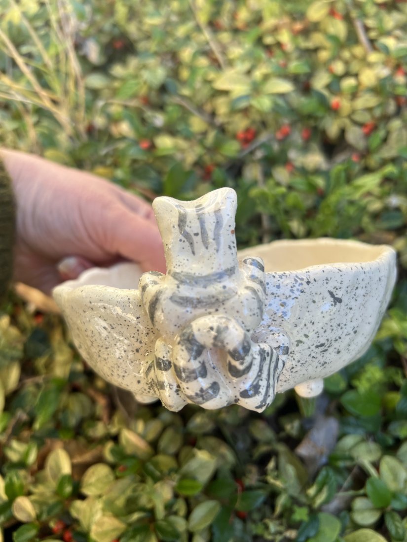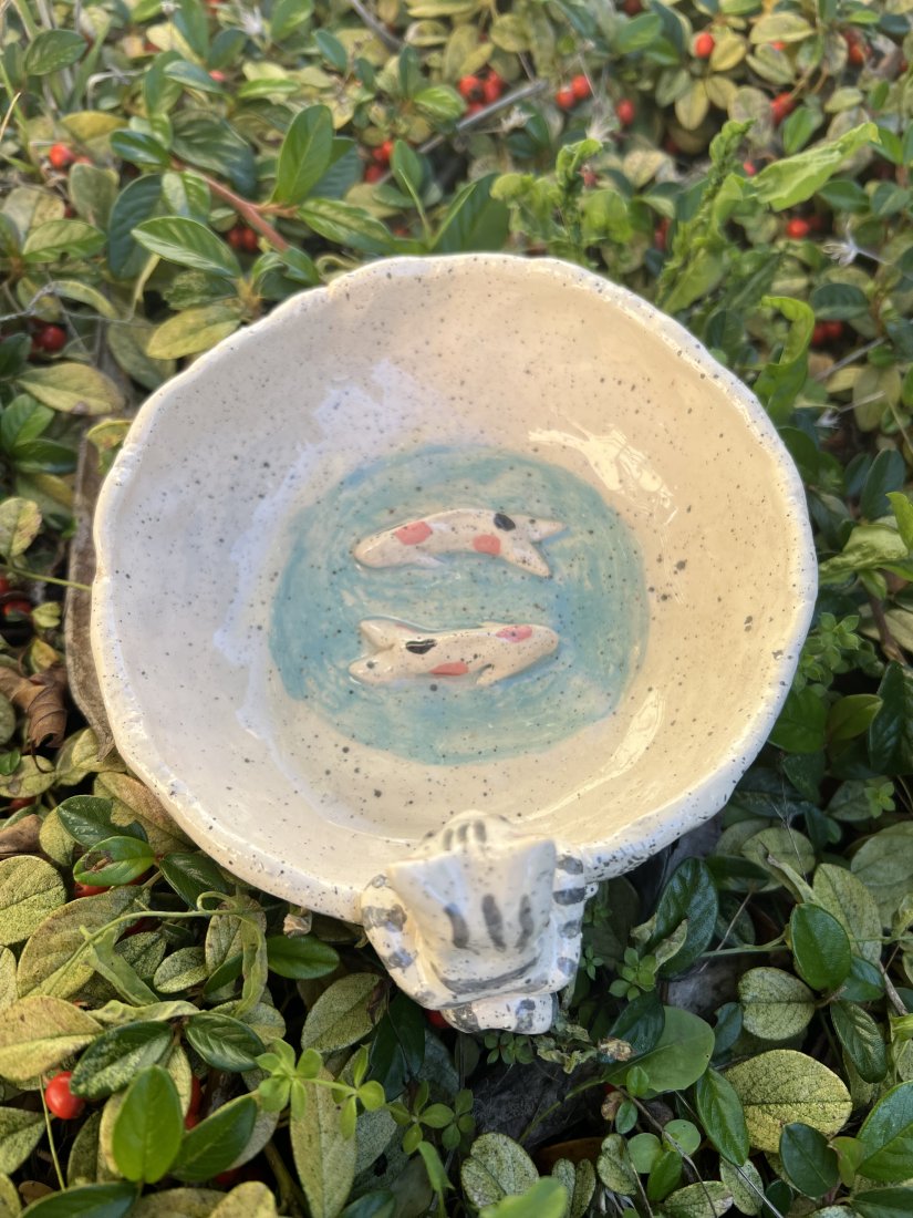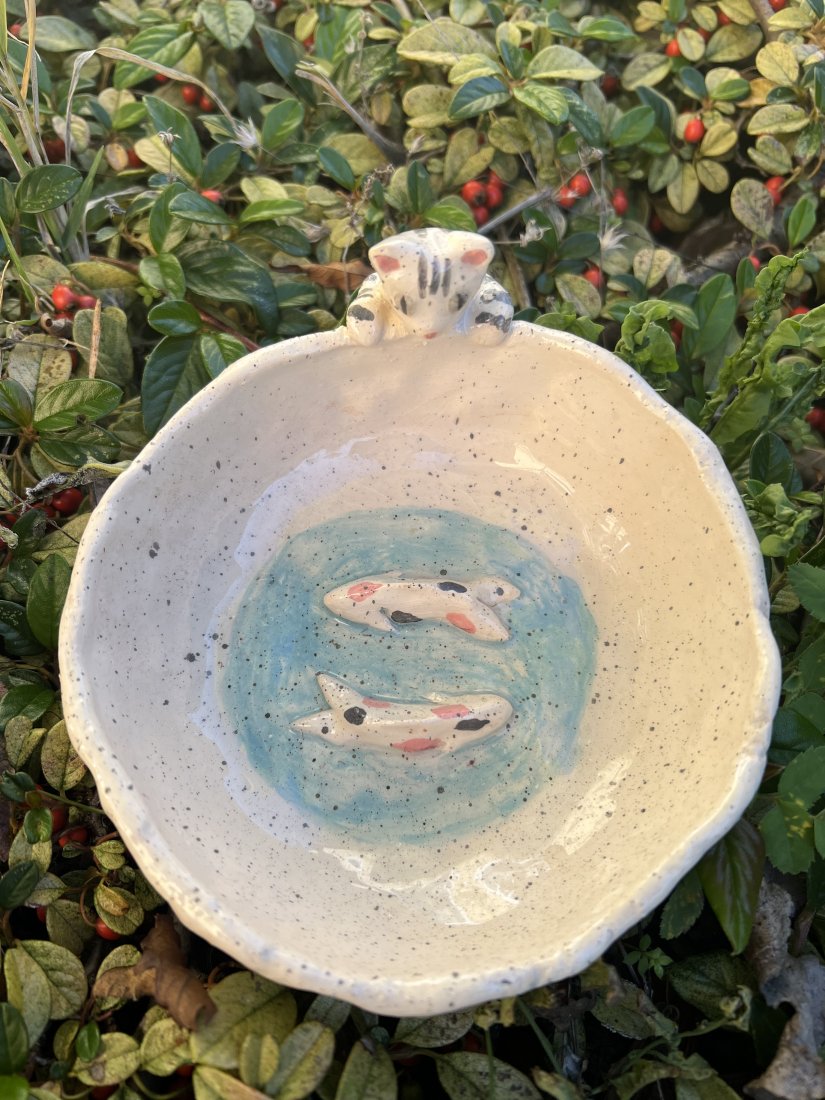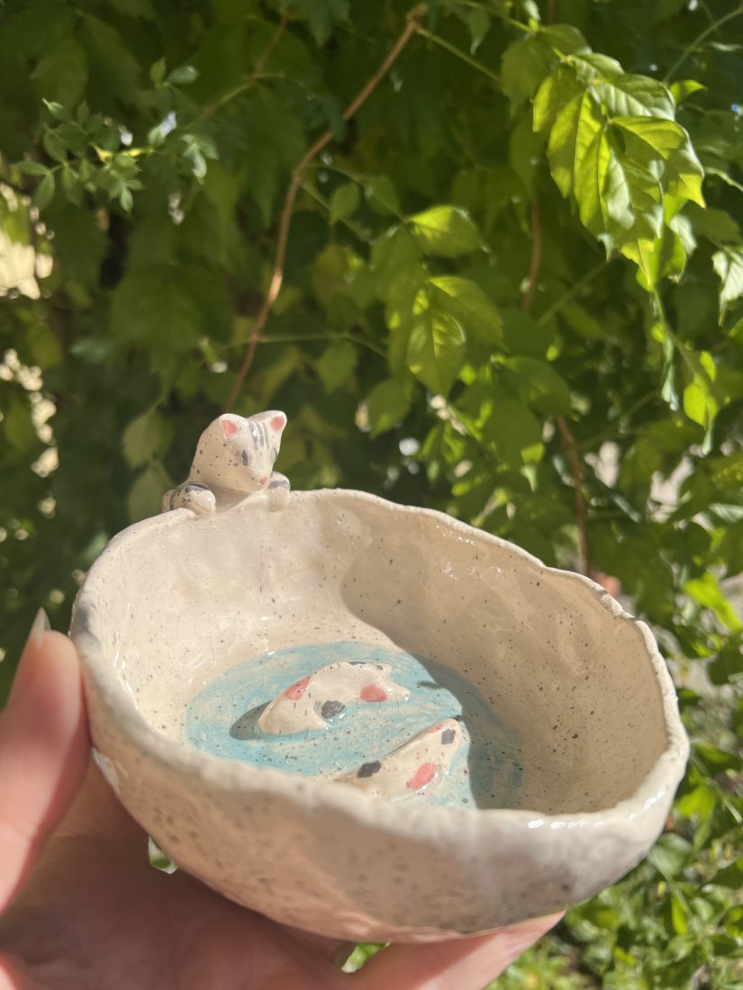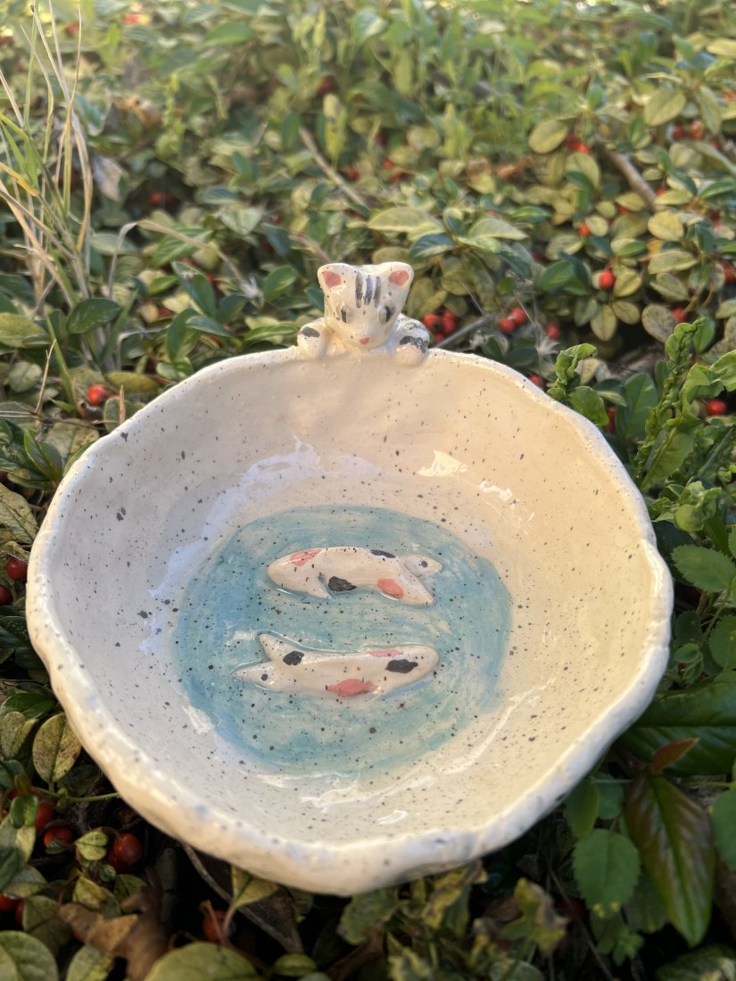 Ta wyjątkowa mała miseczka ceramiczna to unikatowy egzemplarz, który został ręcznie uformowany i pomalowany. W jej wnętrzu pływają dwie maleńkie rybki koi, a na brzegu czuwa ciekawski kotek.