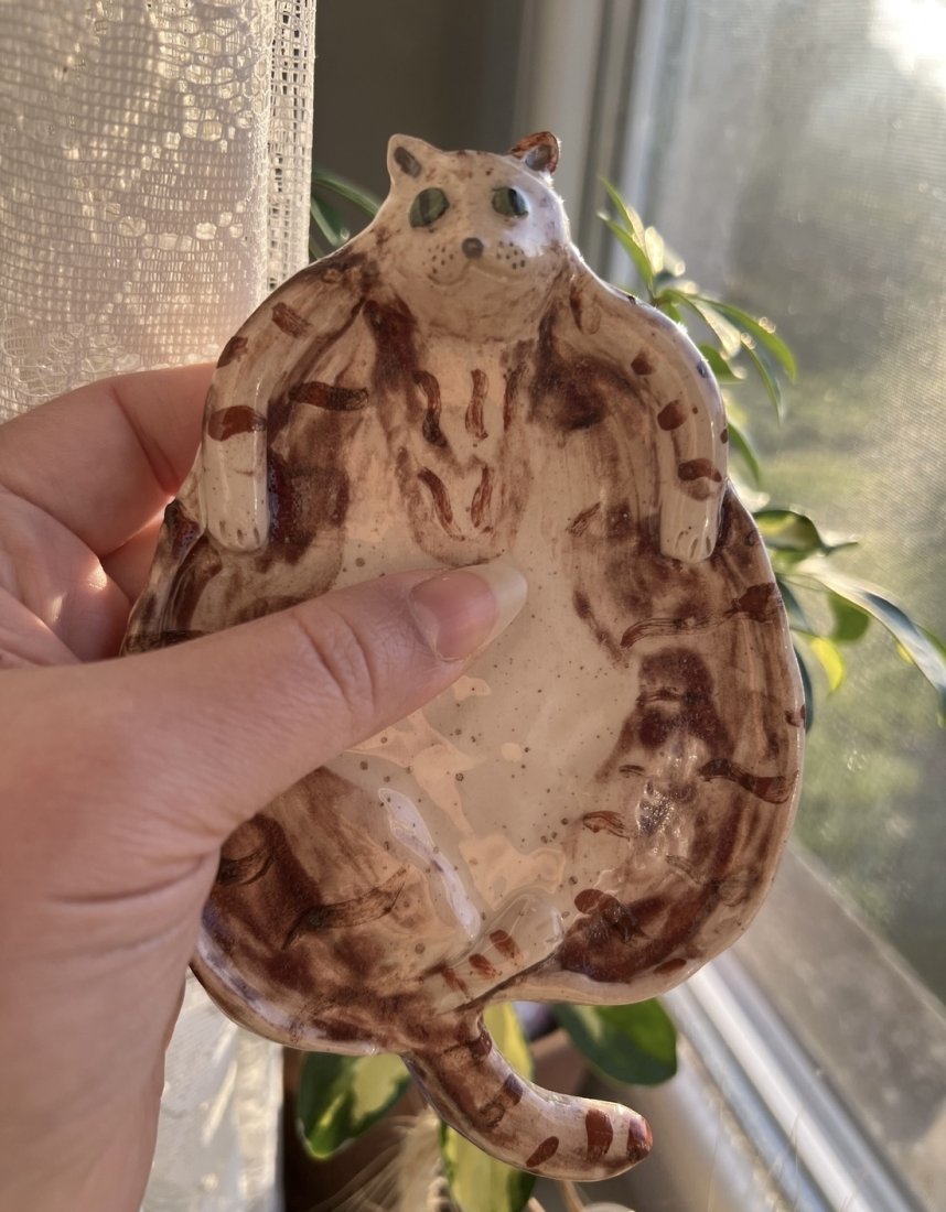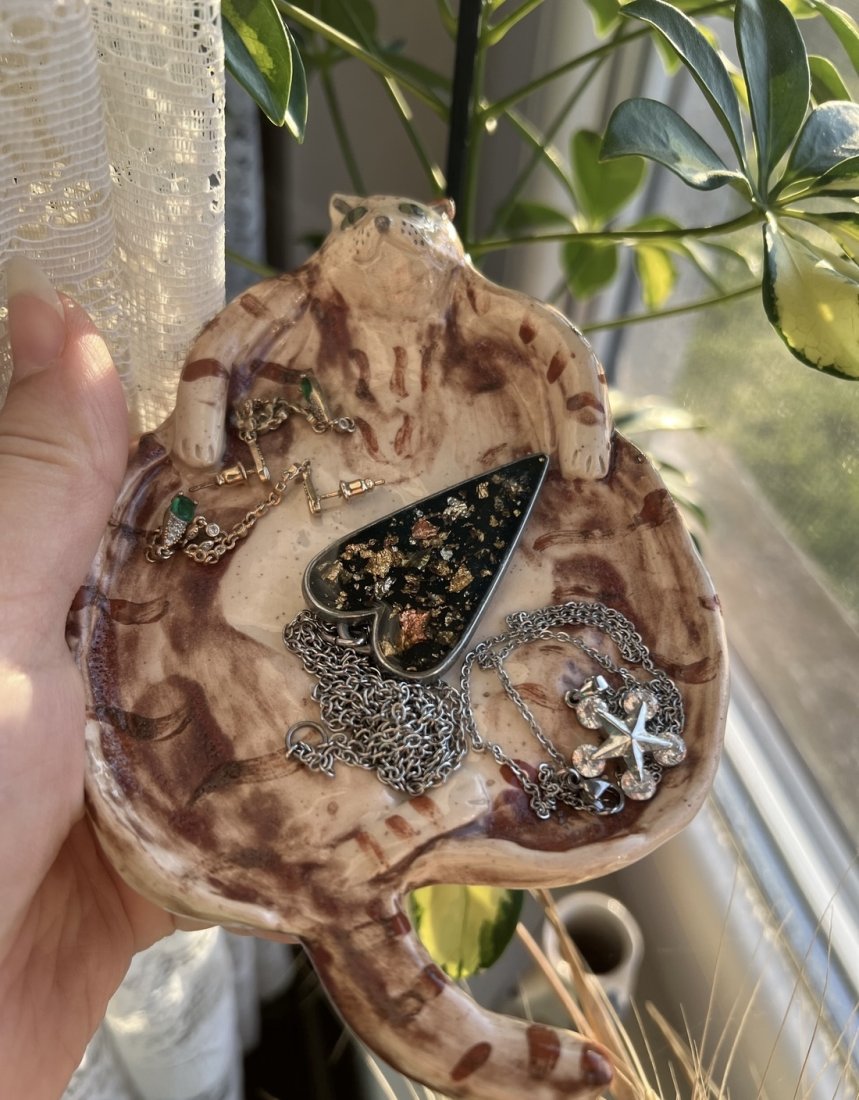 Ta urocza ceramiczna miseczka w kształcie leniwego kota to doskonały wybór do stylowego przechowywania Twoich ulubionych dodatków! Idealna na pierścionki, naszyjniki, kolczyki lub inne drobne skarby. Może być wyjątkową ozdobą toaletki, stolika nocnego lub półki w łazience.