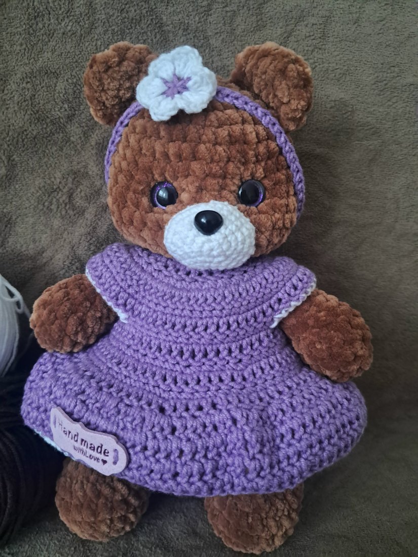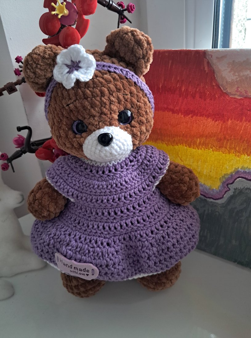 Ręcznie wykonana przytulanka w formie misia pluszowego, idealna do przytulania i dekoracji dziecięcego pokoju. Zabawka wykonana na szydełku z dbałością o każdy detal. Wysokość około 22 sm.
