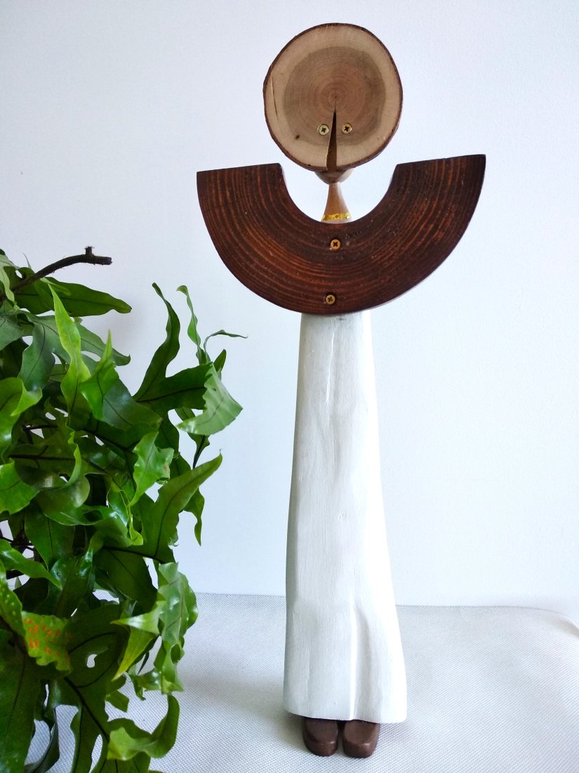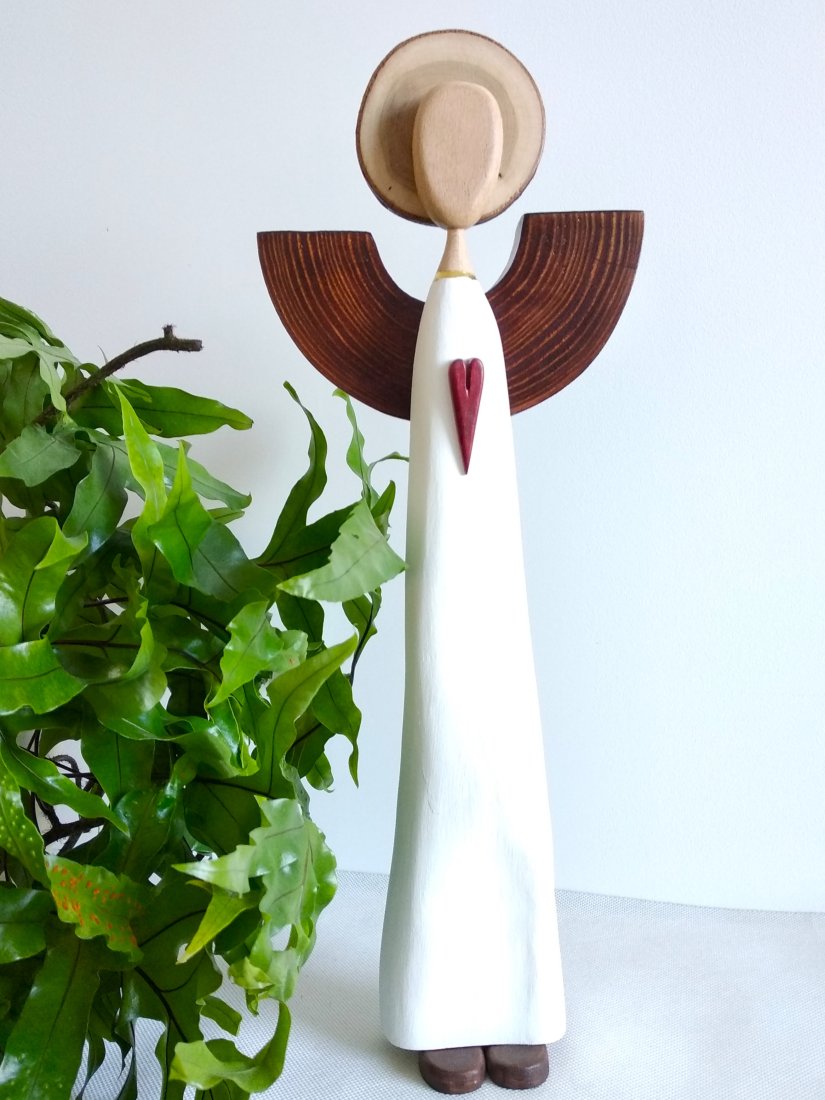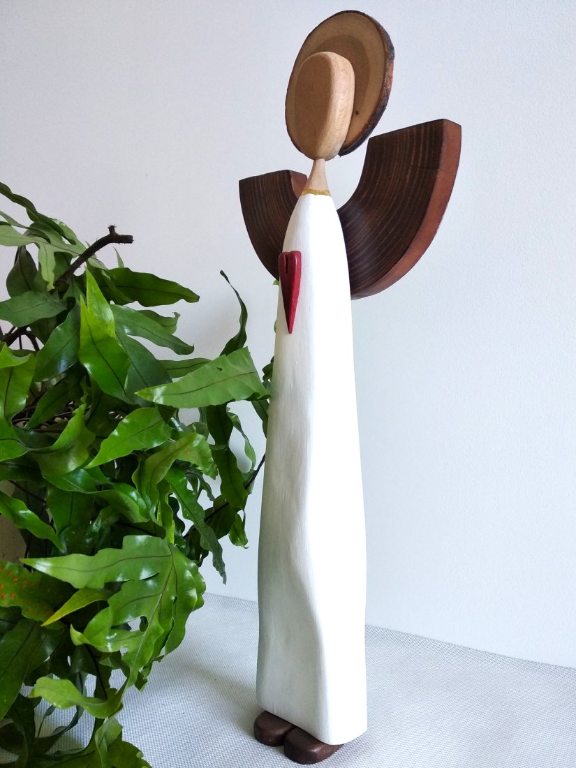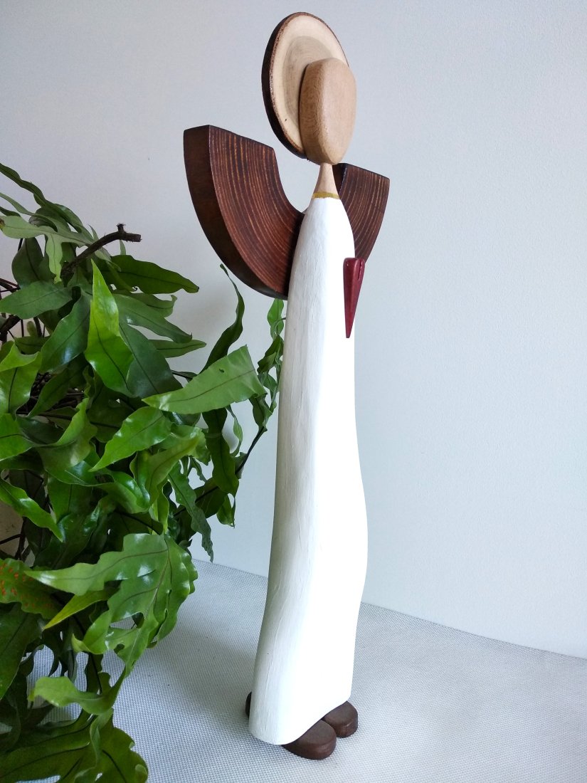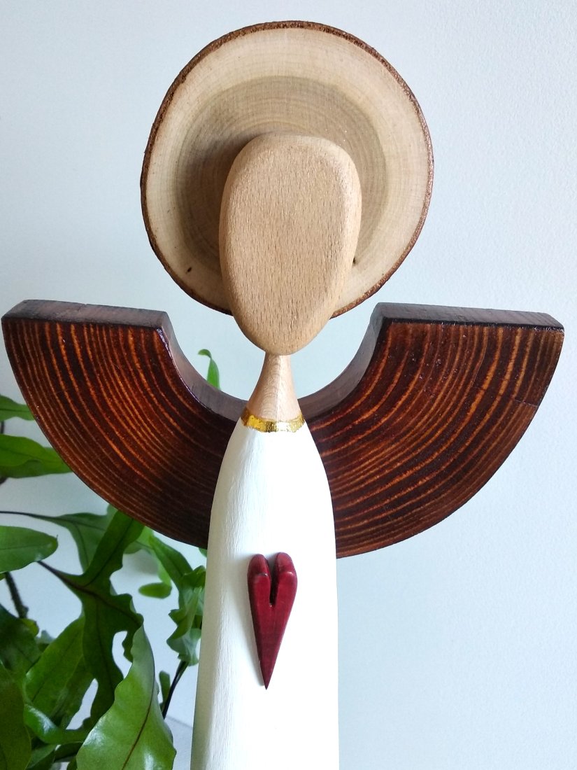Autorski anioł wykonany wykonany ręcznie z różnefgo rodzaju drewna, barwionego bejcą wodną, malowanego akrylową farbą lub pozostawionego w swojej naturalnej barwie.