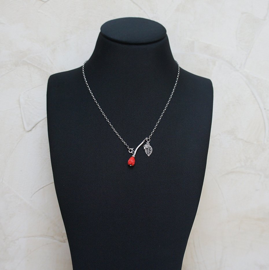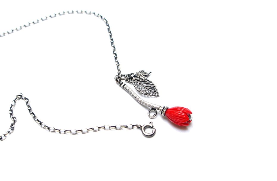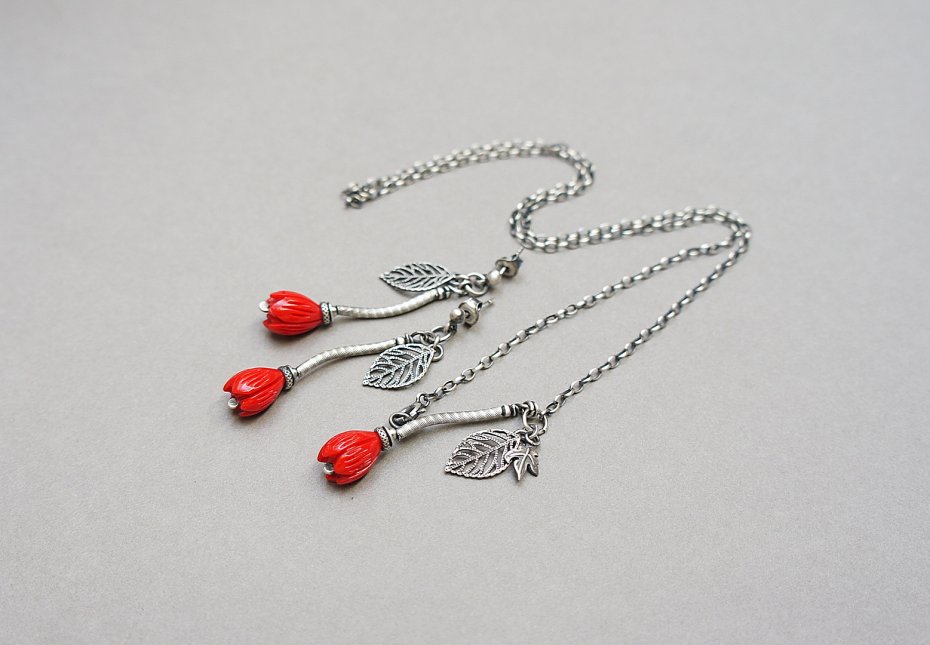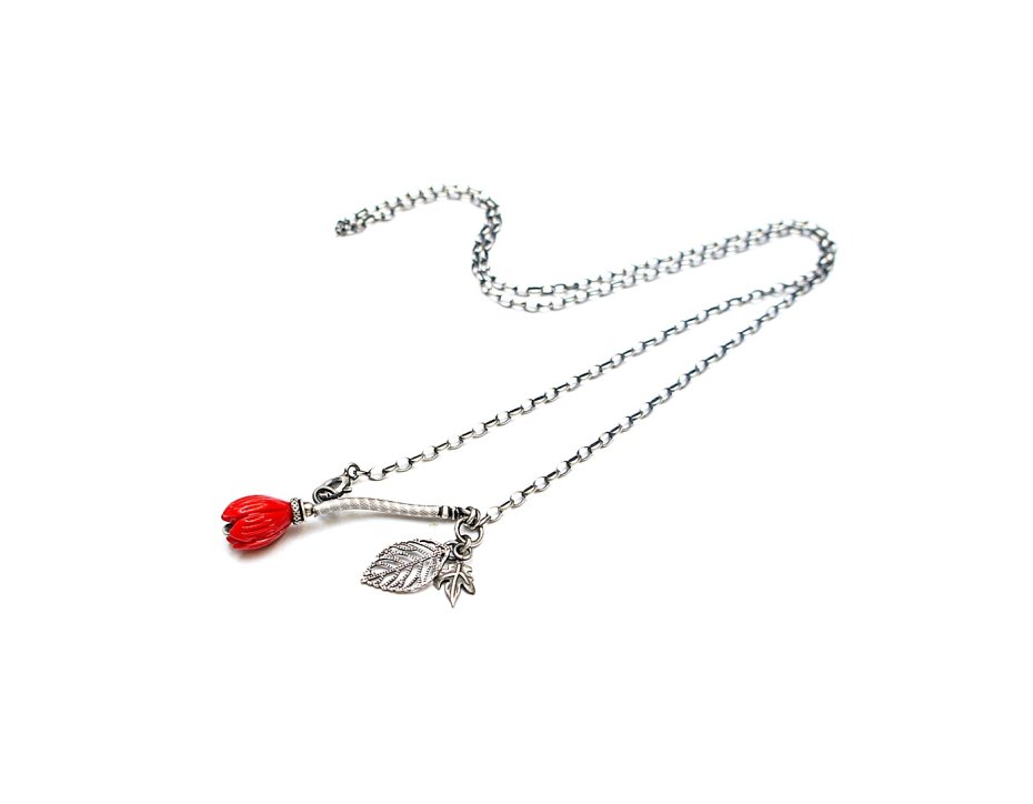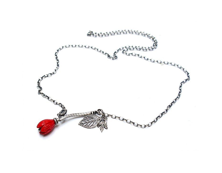 Naszyjnik wykonany ze srebra [pr. 925] w połączeniu z kielichem kwiatu z korala rekonstruowanego [10mm] oraz srebrnym listkiem . Srebro oksydowane i przetarte. Całkowita długość naszyjnika 49,5cm. Biżuteria ozdobnie zapakowana.