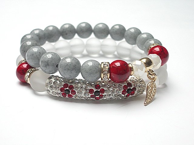 Komplet dwóch bransoletek wykonany z naturalnych kamieni - howlity [10 mm], jadeity [10mm], szklanych matowych kuleczek [10mm], kryształków fasetowanych [8mm], przekładki tuby wysadzanej cyrkoniami [45mm] oraz elementów metalowych w kolorze złotym. Bransoletki z kamieni na gumce silikonowej. Pasują na nadgarstek 15,5-16,5cm. Biżuteria ozdobnie zapakowana
