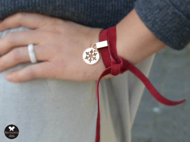Bransoletka typu zamotka wykonana z wysokiej jakości skóry naturalnej mięciutkiej,zamszowej w odcieniu czerwonego wina/burgundu. Ozdobiona przywieszką metalową - śnieżynką w kolorze złota Bez zapięcia do zamotania i zawiązania. Preferowany węzeł prosty. długość ok 50 cm szerokość 1 cm dostępna również w innej kolorystyce Lekka i wygodna. Ładnie układa się na nadgarstku. Opatrzona metką projektanta. W zależności od ustawień monitora, kolory w rzeczywistości, mogą nieznacznie różnić się od przedstawionych na zdjęciu. © wzór chroniony prawem autorskim