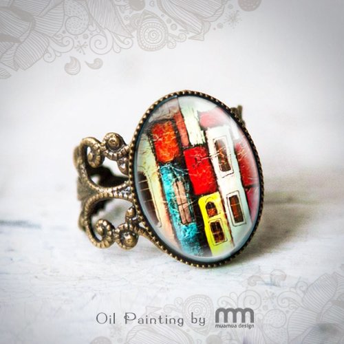 Pierścionek RED HOUSES to bardzo kobiece i malutkie dzieła sztuki, które łączą nowoczesność z odrobiną antycznego powiewu. Obrazek pod szkiełkiem to miniatura autorskiego obrazu. Pierścionek jest regulowany, można dopasować do palca.
