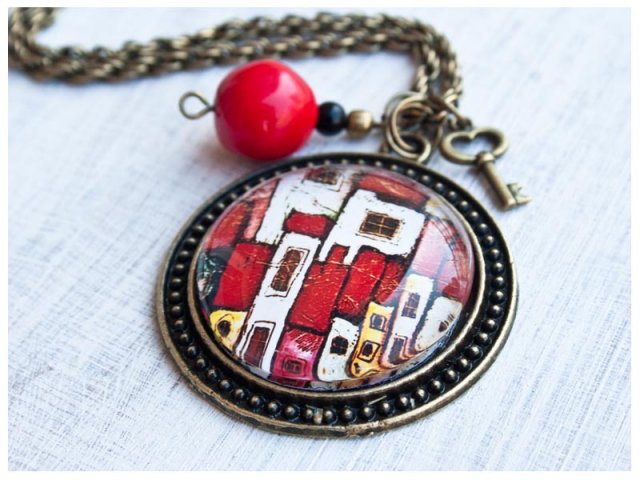 Naszyjnik RED HOUSES to bardzo romantyczne, nostalgiczne i kobiece malutkie dzieło sztuki. Obrazek pod szkiełkiem to wesoła miniaturka obrazu malowanego przeze mnie.