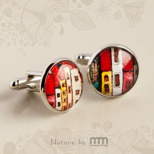 Spinki do mankietów Red Houses to malutkie dzieła sztuki, które łączą nowoczesność z odrobiną antycznego powiewu. Obrazki pod szkiełkiem to ilustracja mojego autorstwa. Idealny prezent dla Pana od Pani ;)