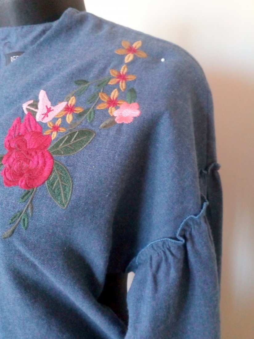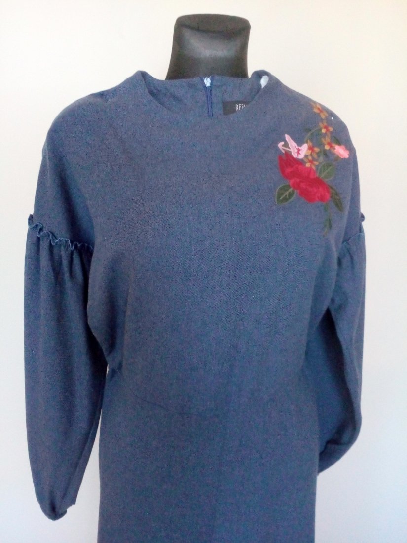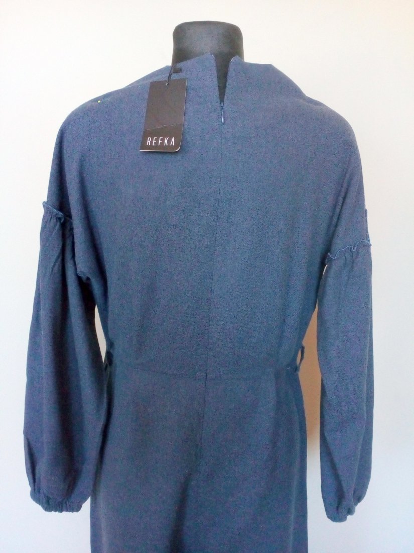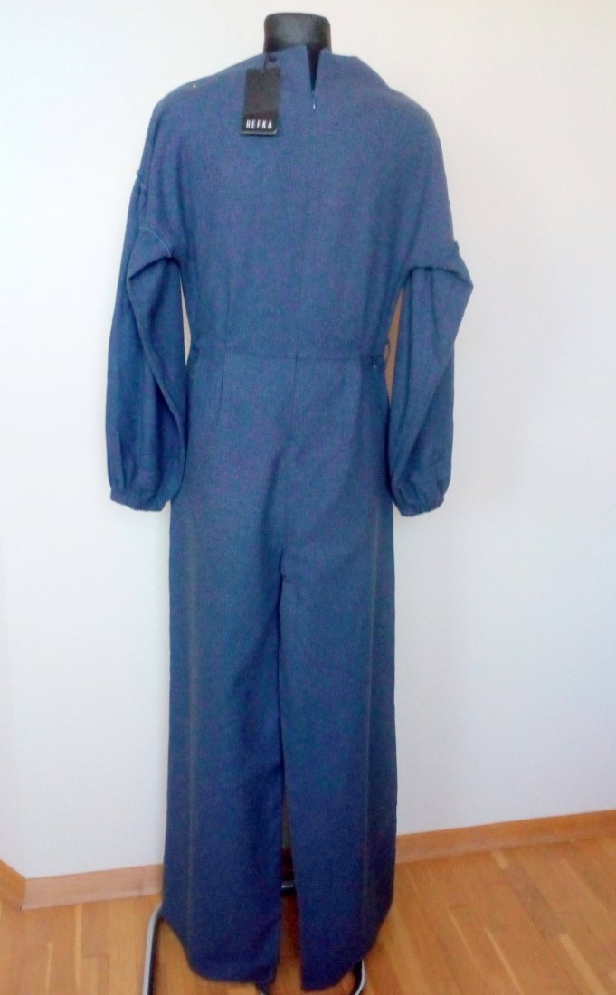 Nowy, ładny kombinezon z szerokimi nogawkami, z miłej, bawełnianej tkaniny w niebieskim, zgaszonym kolorze, zapinany na plecach na długi. delikatny zamek, na lewym boku pełny, kwiatowy haft, rękawy obniżane, w miejscu doszycia marszczone, z małą falbanką, u dołu rękawów wciągnięta guma, w pasie odcinany, po bokach szlufki na pasek, nogawki proste, szerokie, na ramionach poduszki, całość bez podszewki