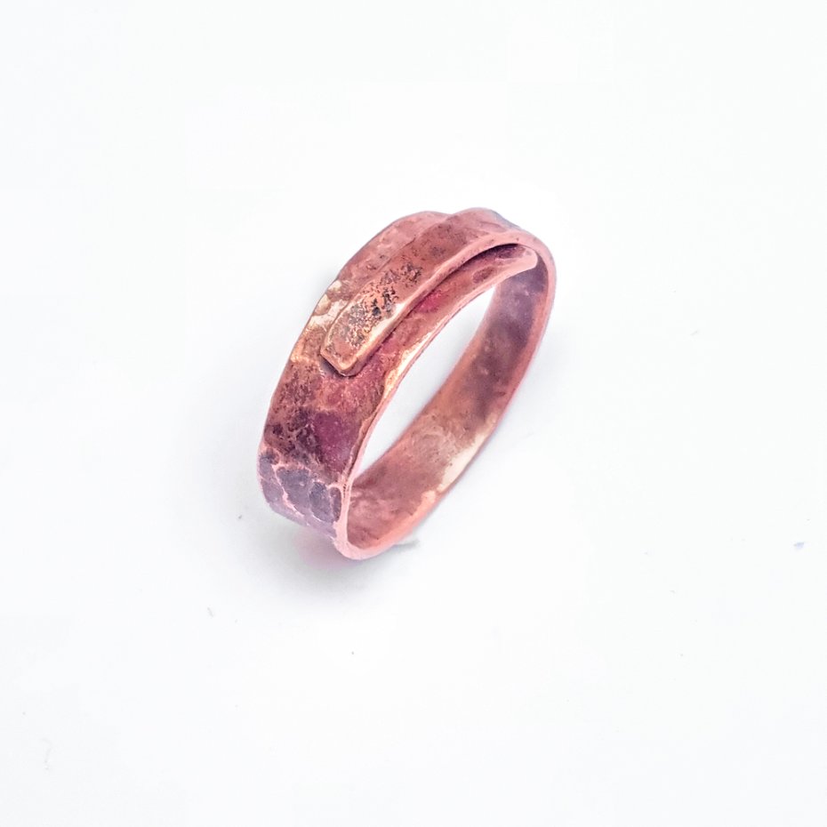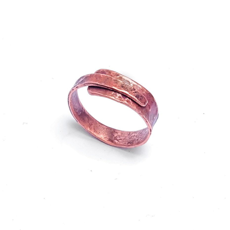 Obrączka z czystej miedzi, ręcznie kuta, repusowana. Zwinięty pasek blachy #0,8mm, dzięki czemu może być dopasowywana w zakresie do trzech rozmiarów +/- . Dobrze "wchodzi" również na kciuk i nie ma obawy by przy spuchnięciu palca jej nie zdjąć. Naturalna patyna ogniowa, w każdym egzemplarzu będzie nieco inna.