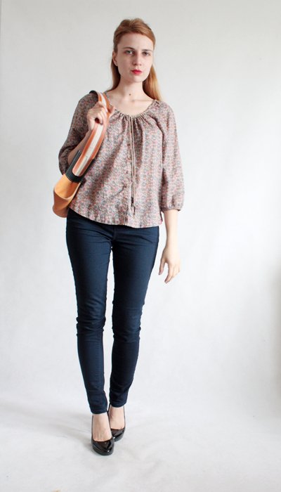 Bluzka ze stuprocentowej, miękkiej bawełny. Na górze troczek, który umożliwia regulację dekoltu w zależności od okazji. Zapięcie na dyskretne, małe guziki.