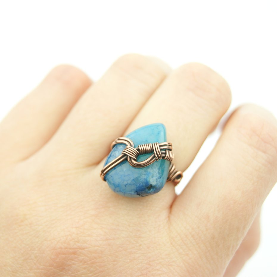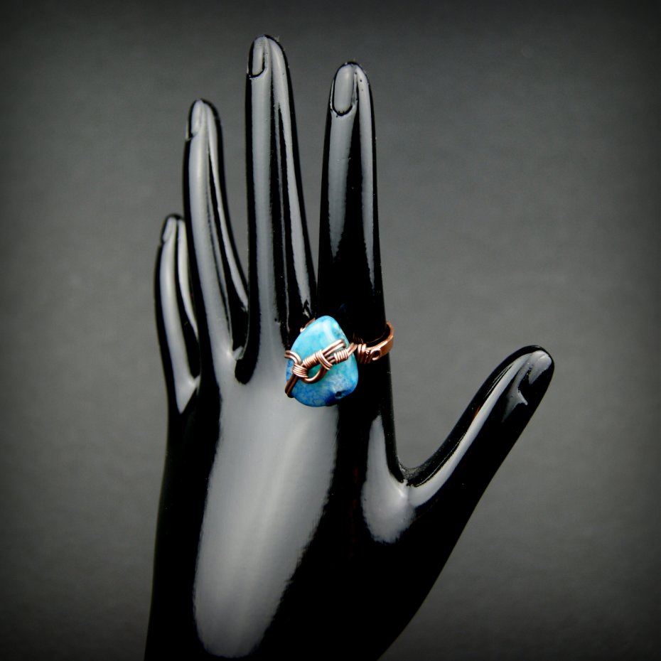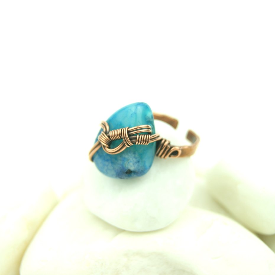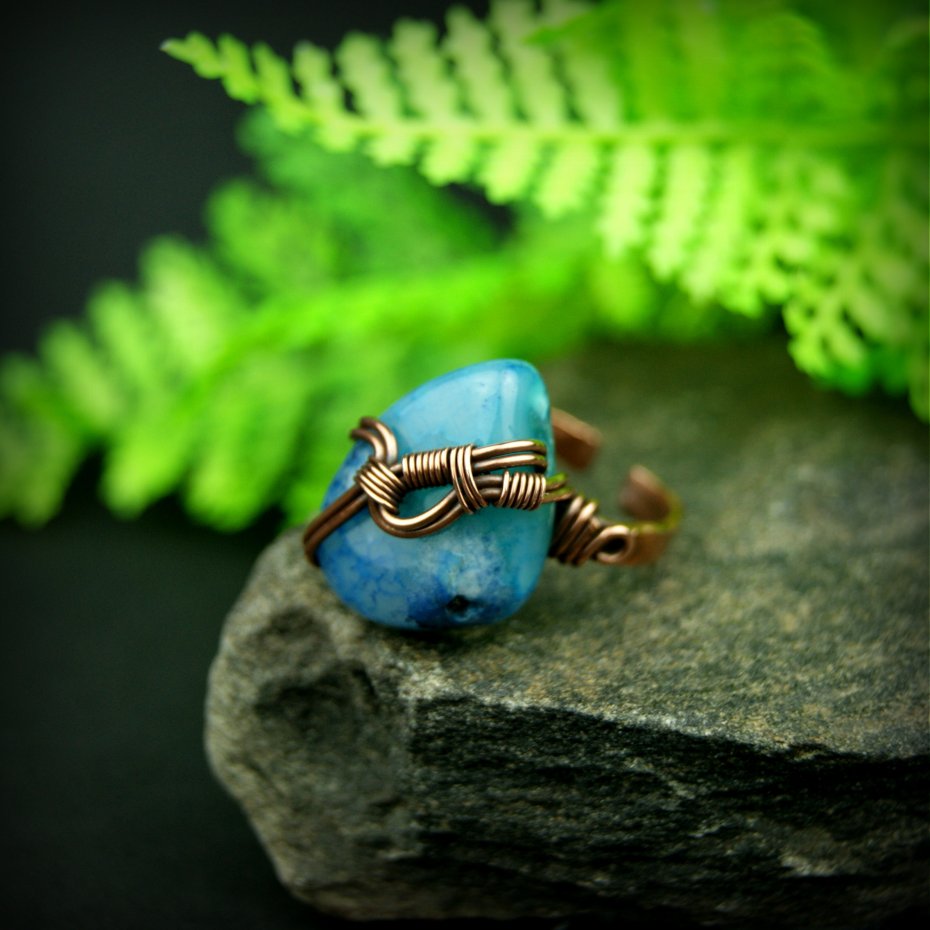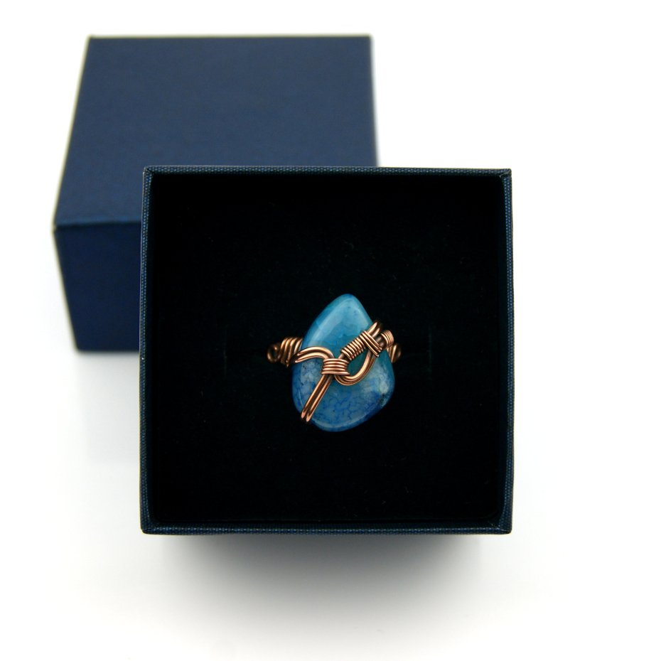 Pierścionek wykonany w pracochłonnej technice wire wrappingu. Centralnym punktem jest tu duży niebieski agat, który został misternie opleciony miedzią. Pierścionek w uniwersalnym rozmiarze, możliwość regulacji.