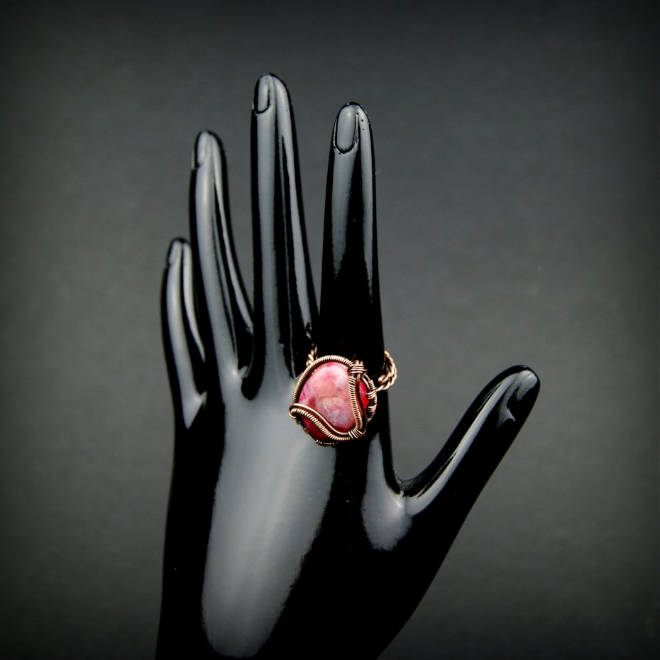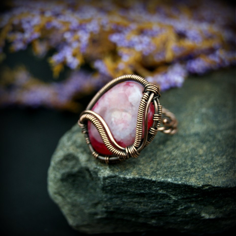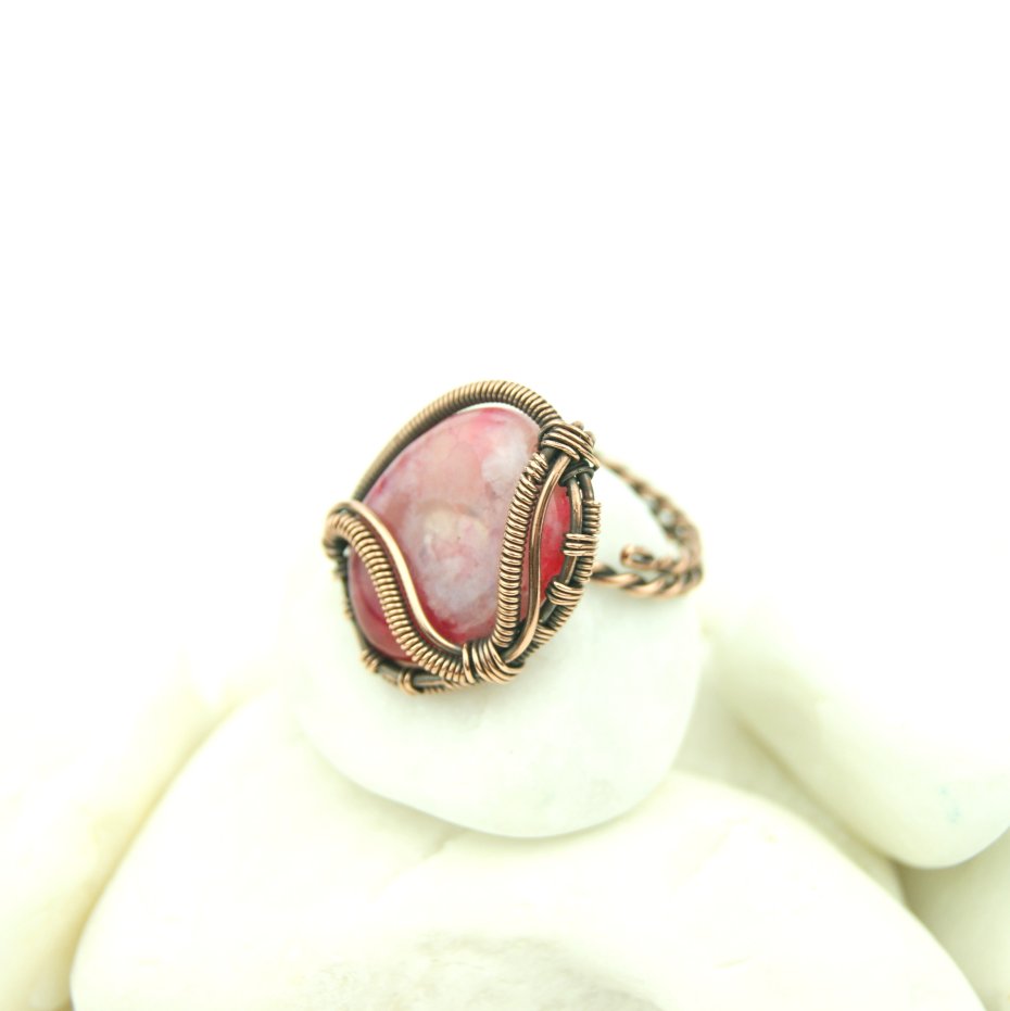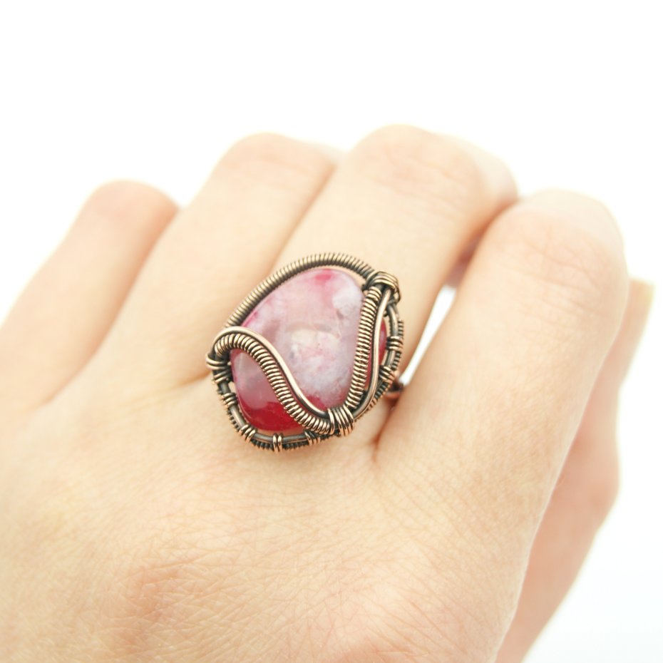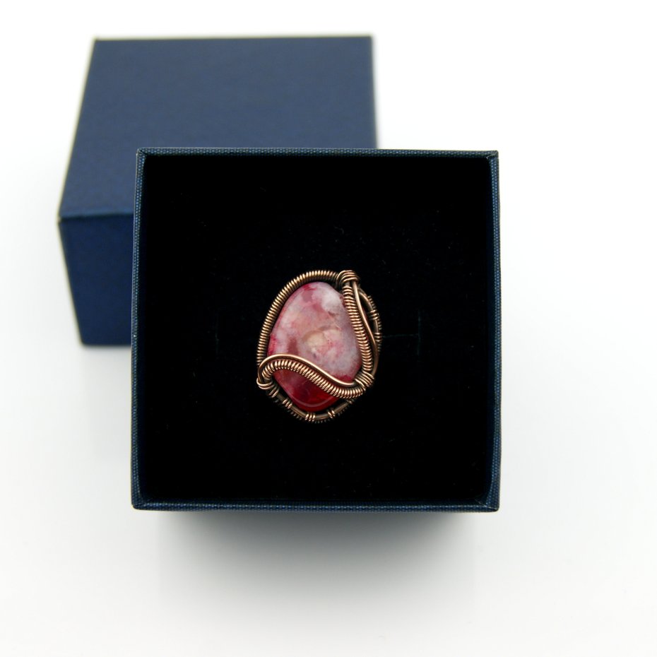 Pierścionek wykonany w pracochłonnej technice wire wrappingu. Centralnym punktem jest tu duży różowy agat, który został misternie opleciony miedzią. Pierścionek w uniwersalnym rozmiarze, możliwość regulacji.