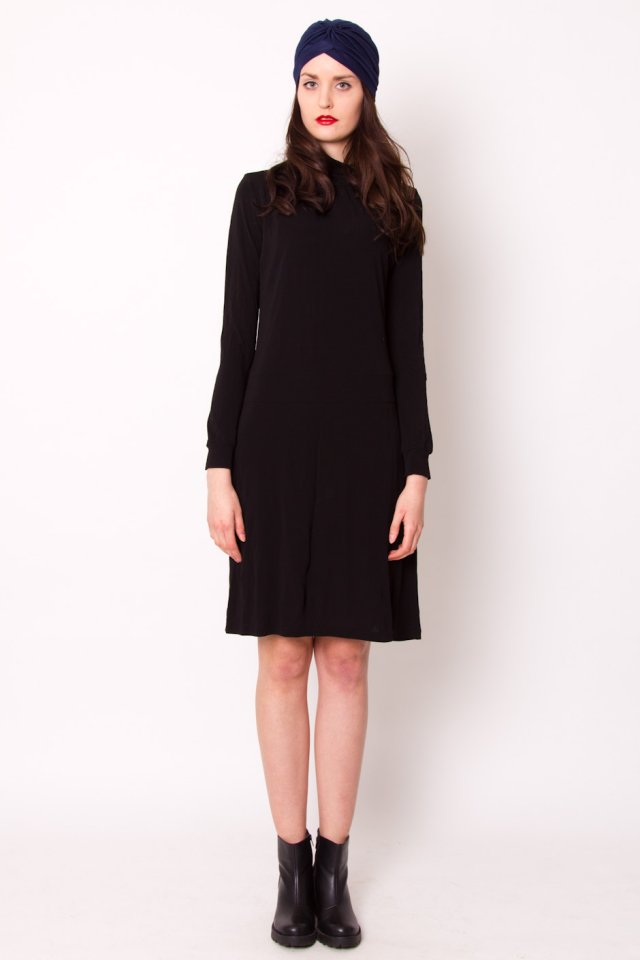 Czarna elastyczna, minimalistyczna sukienka z obniżonym pasem. Długi rękaw, stójka, zapinana z tyłu na okrągłe powleczone materiałem guziczki.